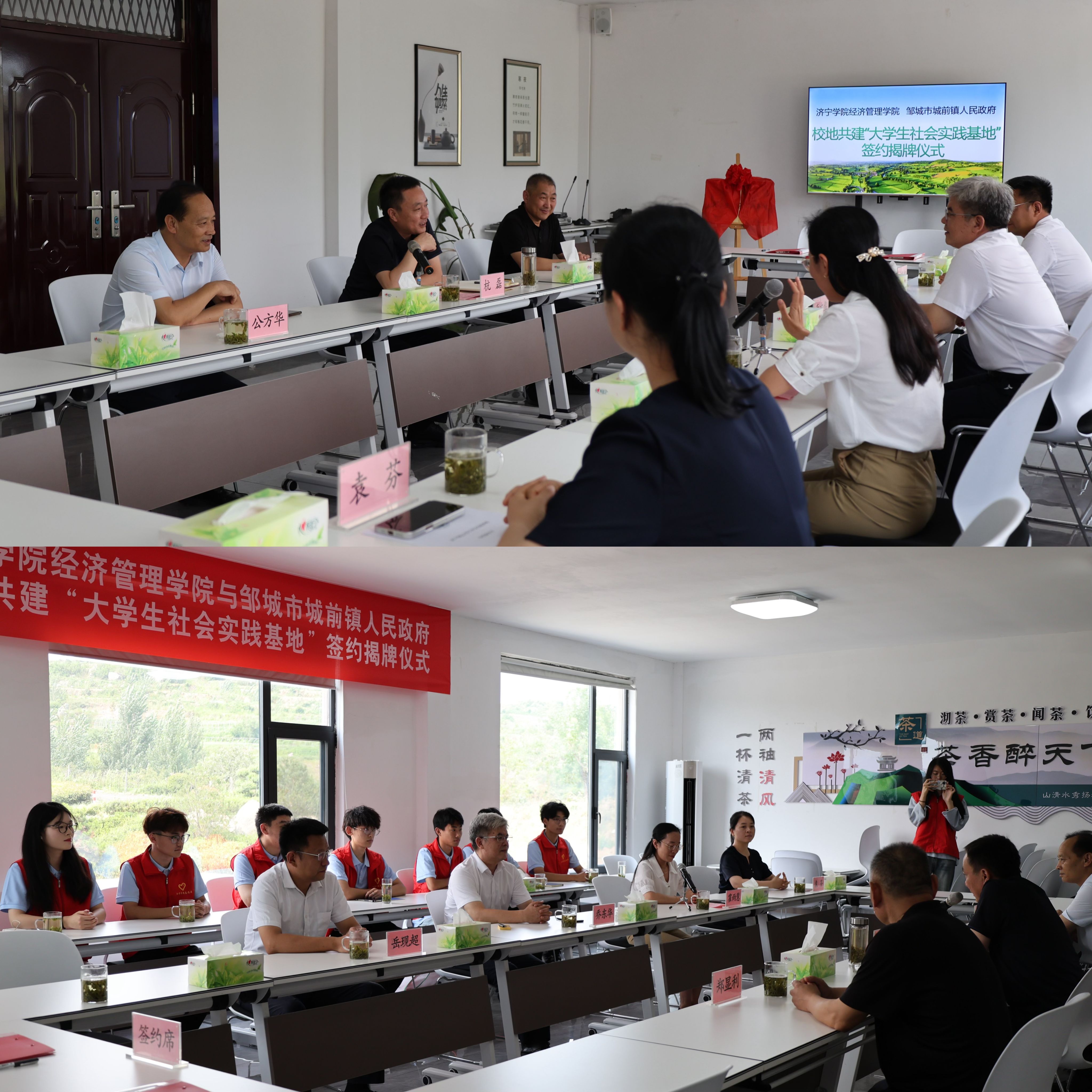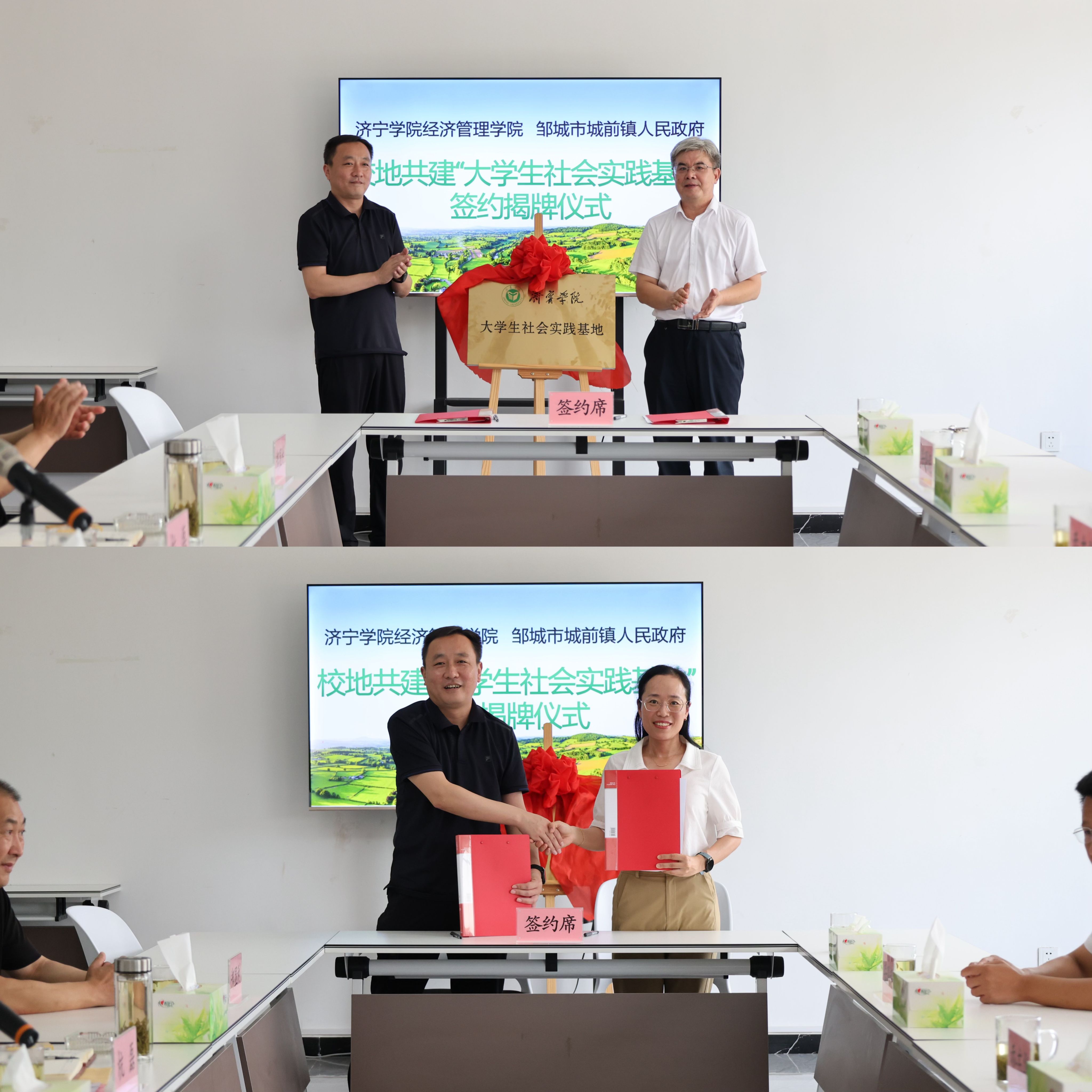 仪式上,乔东华与杭磊共同为大学生社会实践基地揭牌,霍雨慧与杭磊签署了大学生社会实践基地共建协议书。