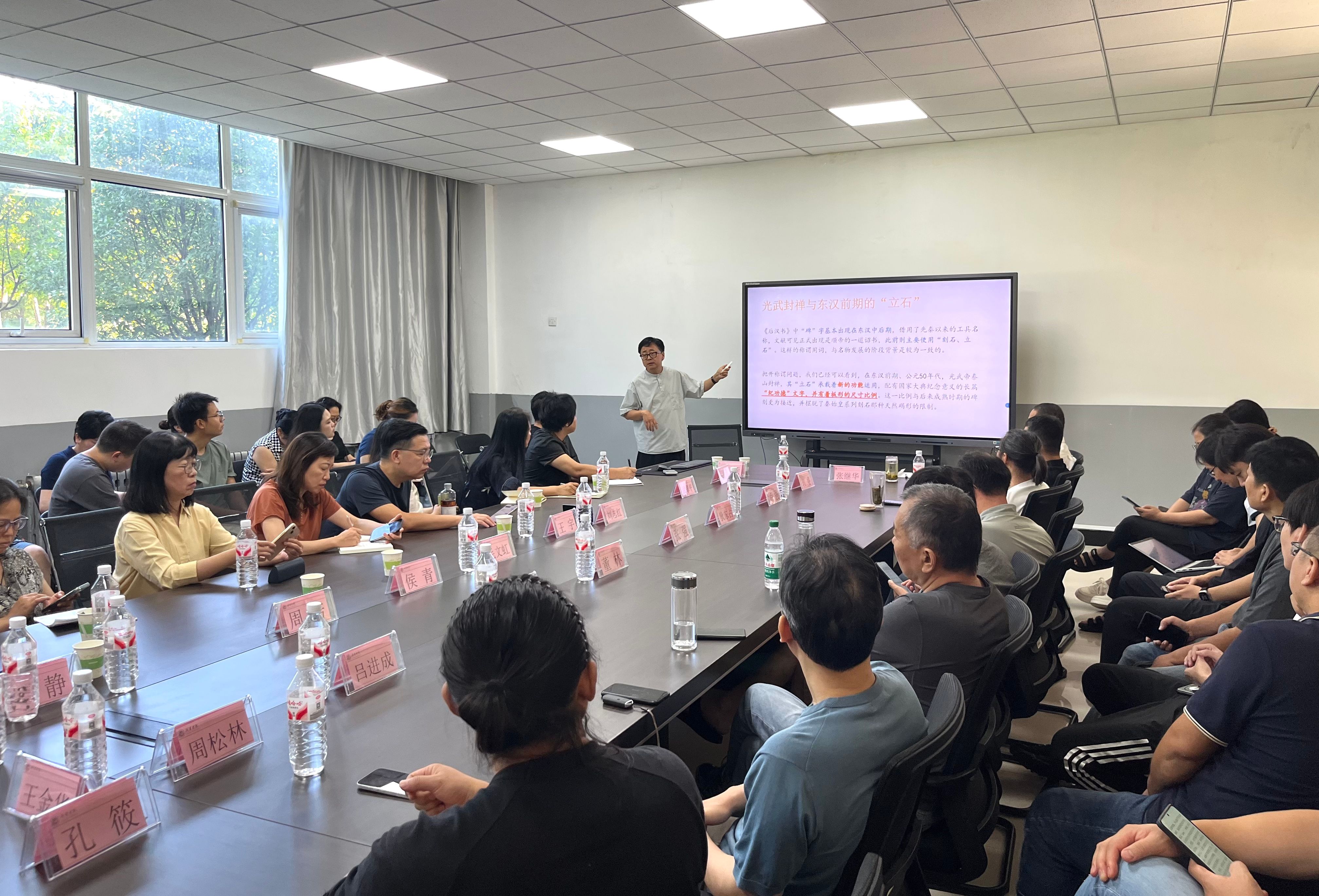 研讨会上,与会教师立足日常教学科研实践案例,围绕“优秀传统文化深化研究与挖掘”“文化IP开发与产业落地”“艺术赋能新质生产力”等问题,与杨频教授及北大校友团队展开深度对话,双方从学术研究、实践应用、产业对接等多维度深入交流,现场互动氛围热烈,为后续合作奠定基础。随后,杨频以《中国士阶层之纪念碑刻的起源、类型与影响》为题作学术报告,系统剖析了士阶层纪念碑刻的核心概念、历史起源与发展脉络,着重强调“文献与考古结合、实物优先”的研究方法,为在座教师提供了极具启发的研究方法与构建路径。