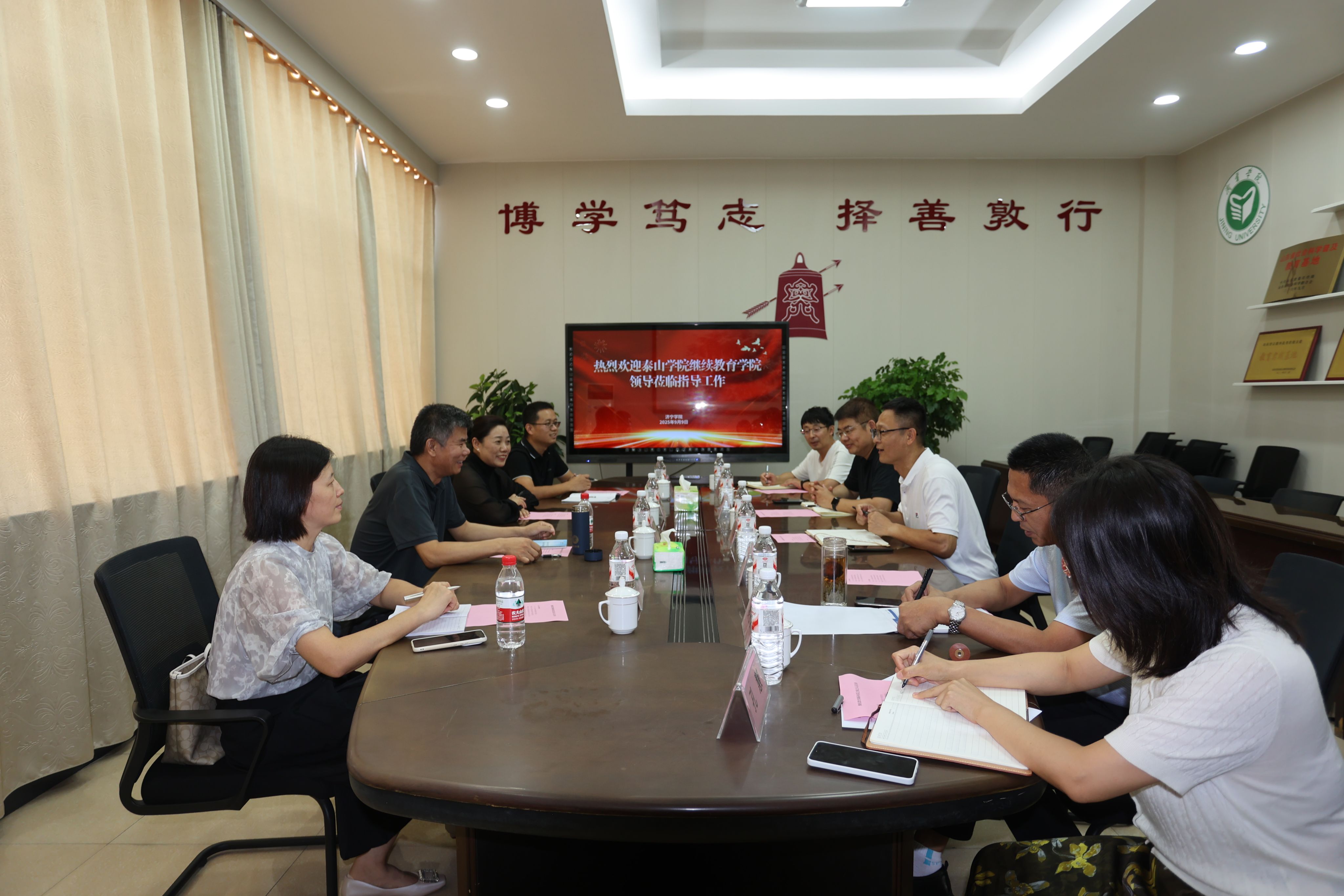 9月9日,泰山学院继续教育学院院长宋涛、副院长李艳艳等一行4人到访我校,双方围绕学历教育继续招生、非学历教育管理运行模式、退役军人培训及其他培训工作等主题展开深入交流,共绘高校协同发展蓝图。教育培训学院院长曹光海、副院长秦胜营、耿亮、杨波及相关工作人员参加交流。活动由曹光海主持。