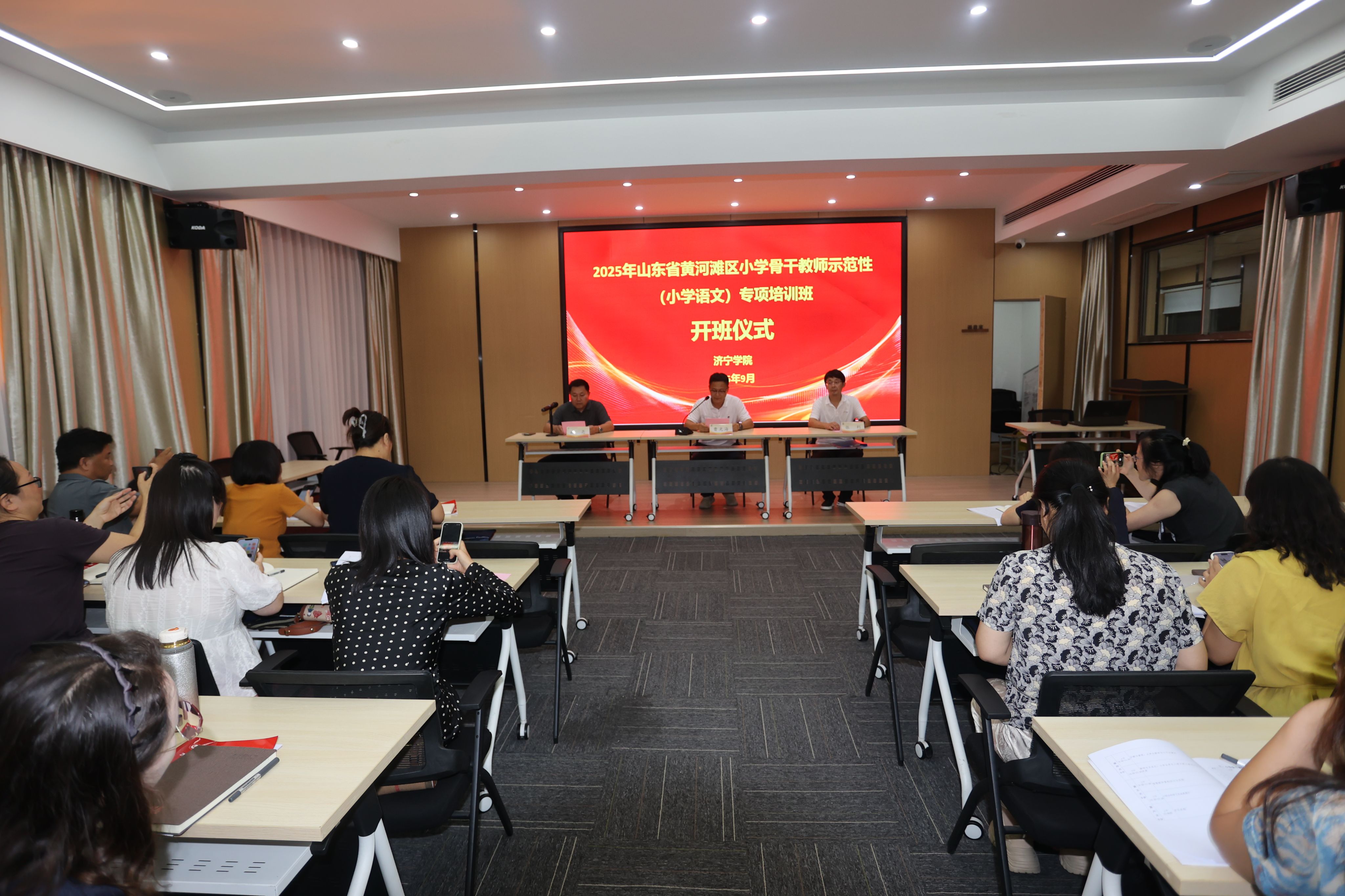 9月14日,2025年山东省黄河滩区小学骨干教师示范性培训(小学语文)专项培训在我校顺利开班。教育培训学院院长曹光海、副院长耿亮、培训科张利及来自全省的50名小学语文骨干教师参加活动。开班仪式由耿亮主持。