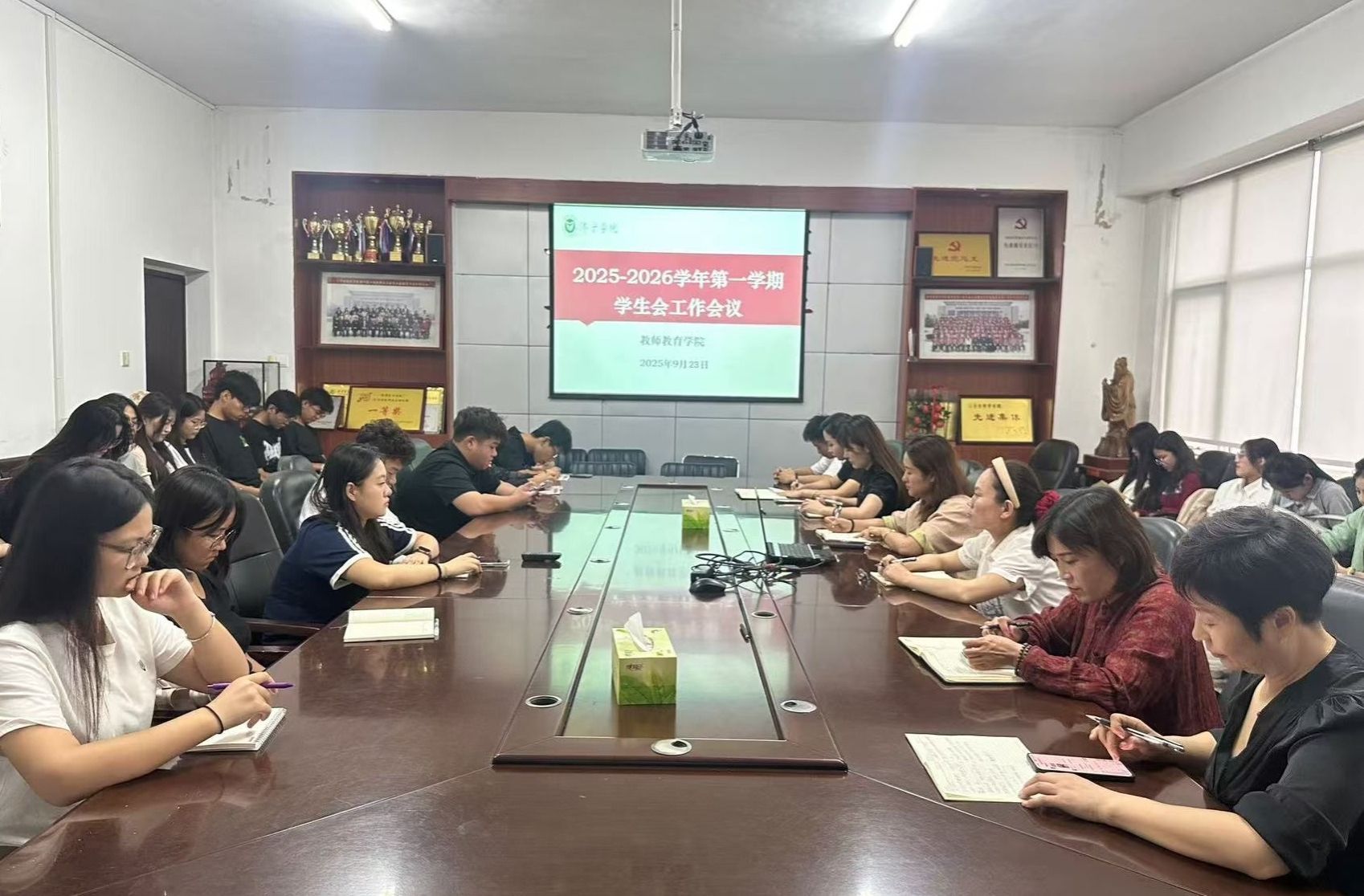 为加强学生干部队伍建设,增强团队凝聚力、执行力,9月23日下午,教师教育学院在2号楼A211召开2025-2026学年第一学期学生会工作会议。教师教育学院党委副书记杜鹃、团委书记徐艳艳、辅导员及2024届全体学生会干部参加会议。