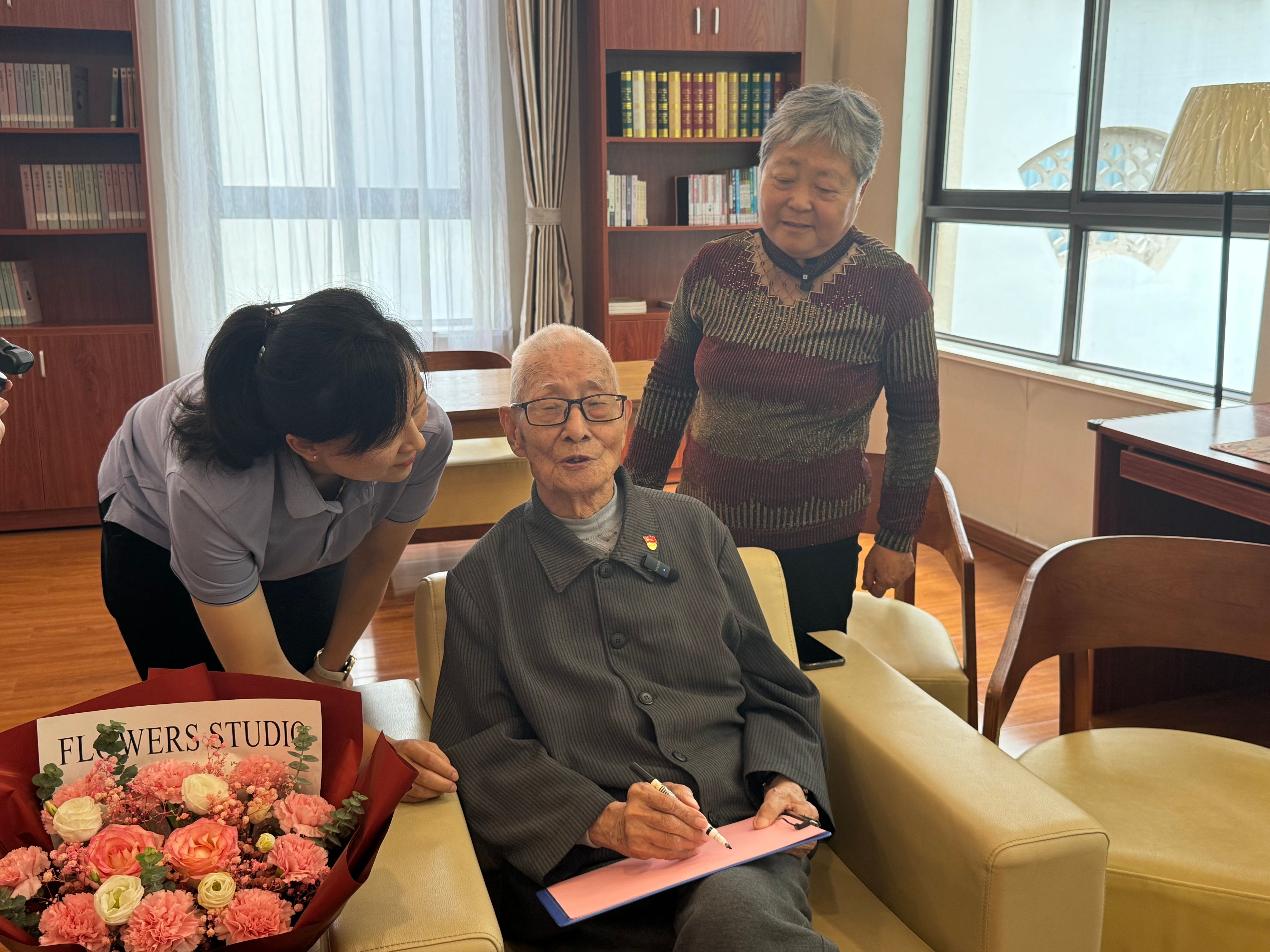 刚见到薛洪琪老人时,他被院长推着出来,虽已95岁高龄,但腰背依旧挺拔,双目炯炯有神,言谈间透着军人特有的坚毅。“我14岁就参军了,是个卫生兵,那时候就想着能多救一个战友,多为国家出一份力。从抗日战争到抗美援朝,就盼着什么时候能过上好日子”回忆起抗战岁月,老人的声音虽有些沙哑,却字字清晰。在那个缺医少药、炮火连天的年代,卫生兵的战场没有硝烟,却时刻面临生死考验。为救战友他的腹部、腿部、后背等多处都留下了子弹“勋章”。