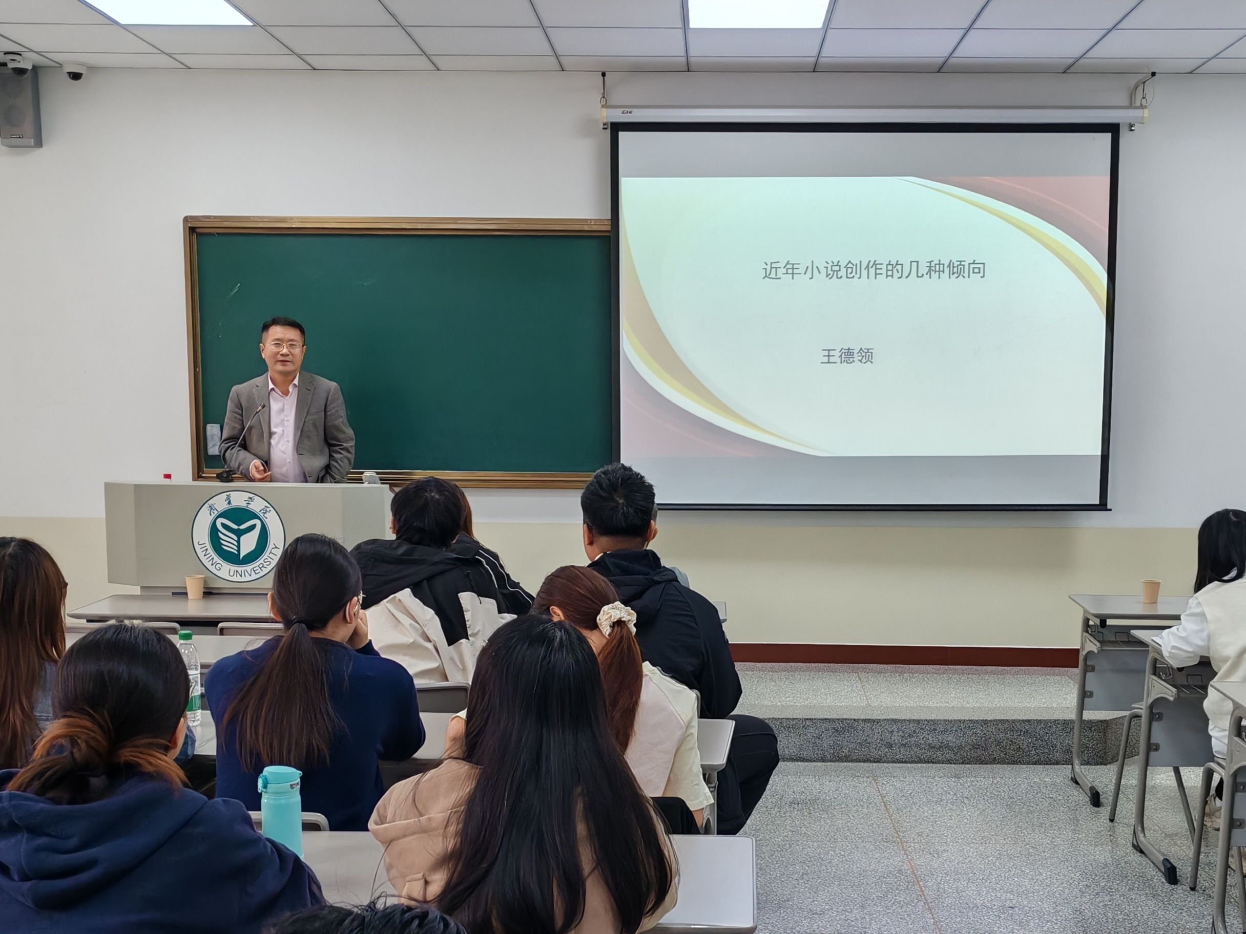 讲座伊始,人文与传播学院党委书记王永超代表学院为王德领教授颁发“校友大讲堂” 铭牌,对其莅临分享表示热烈欢迎与诚挚感谢。讲座中,王德领围绕“近年小说创作倾向” 展开深度剖析。他指出,在当前文学创作语境下,城市题材已逐步取代传统乡土题材的主流地位,乡土题材创作呈现式微态势;同时,他以多部近年具有代表性的长篇小说为案例,详细阐释了 “知识性写作” 在当代文坛的兴起逻辑与创作特征,为学生理解现代文学发展脉络提供了清晰视角。
