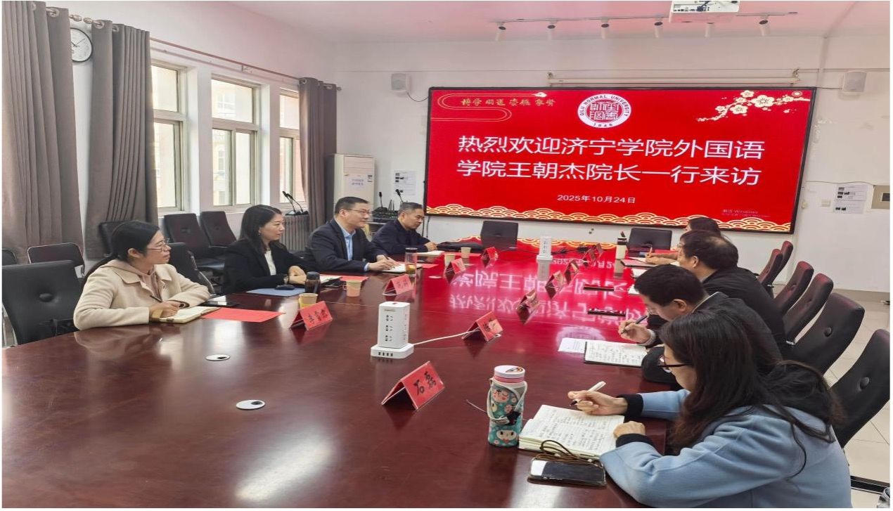 为学习借鉴兄弟院校在学科建设、人才培养与科学研究方面的先进经验,进一步推动学院高质量发展,10月24日,外国语学院院长王朝杰,学术副院长范莉,英语专业负责人吴瑞民及商务英语系主任李霄露赴齐鲁师范学院外国语学院开展学习交流。齐鲁师范学院外国语学院院长宋秀葵,党委副书记迟英娟,副院长谢士金、陈锋,办公室主任朱慧,跨境电子商务专业教研室主任石磊,英语教师教育教研室主任张力文参加交流。