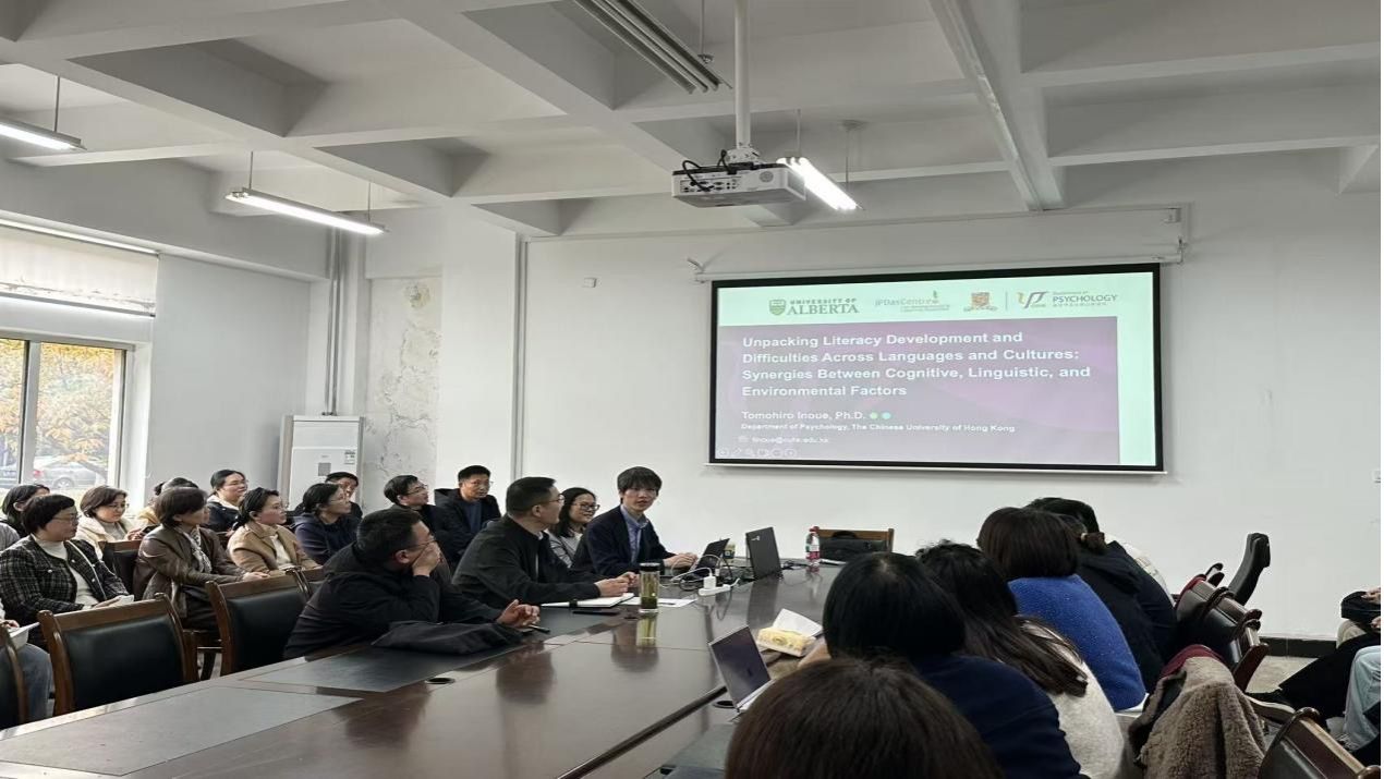 11月6日下午,亚星在线登录官网外国语学院举办学术报告。香港中文大学心理学系助理教授Tomohiro Inoue受邀作题为“Unpacking literacy development and difficulties across languages and cultures: Synergies between cognitive, linguistic, and environmental factors”的专题分享。报告由学院院长王朝杰主持,学院全体教师参会聆听。