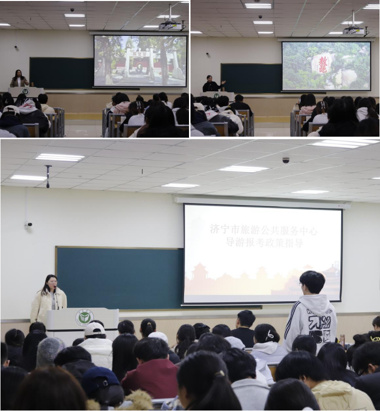 在随后的交流环节,学生围绕导游职业能力提升、行业发展趋势等问题,与一线从业者展开深入交流。济宁市旅游公共服务中心副主任唐宏就学生关心的导游资格考试政策、行业就业导向等问题作了现场解答与专业指导。本次活动是旅游管理专业推进产教融合、创新实践教学模式的具体举措。通过引入行业专家与一线从业者进课堂,有效拓展了学生的专业视野,增强了学生的职业认同感,也为进一步深化校企合作积累了实践经验。