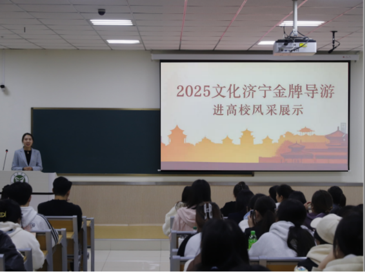 活动中,来自济宁市各县市区的23名金牌导游培训班学员依次登台,围绕曲阜“三孔”、尼山圣境、微山湖、梁山等核心文旅资源进行现场讲解。展示内容充实、节奏紧凑,生动呈现了济宁市丰富的历史文化与旅游特色,为学生提供了观摩学习一线实战技能的宝贵机会。