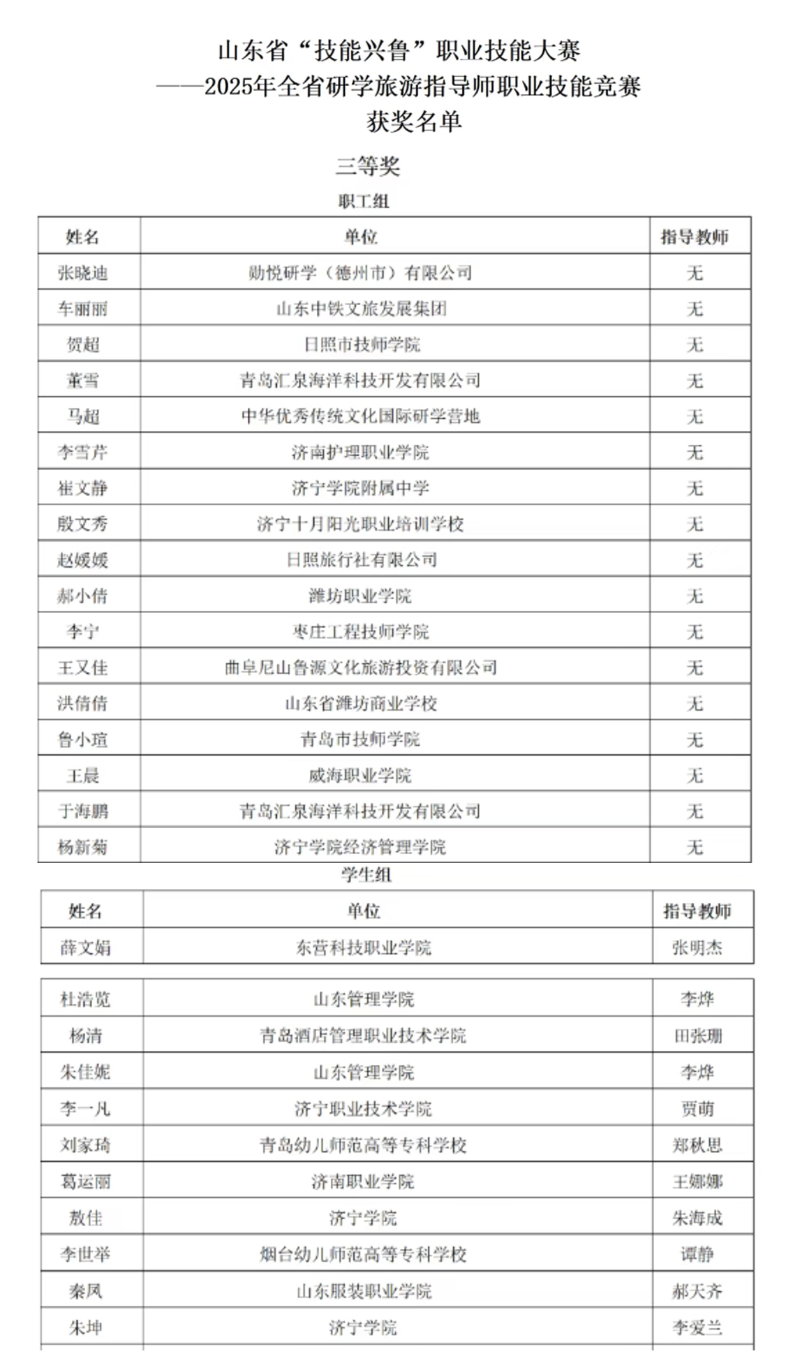 10月21日至23日,2025年山东省研学旅行指导师竞赛决赛在济宁职业技术学院举行。近日,比赛成绩揭晓,经济管理学院教师杨新菊与旅游管理与服务教育专业学生敖佳、文化产业管理学生朱坤分别获职工组三等奖和学生组三等奖,充分展现了我校师生卓越的研学专业技能和创新能力。