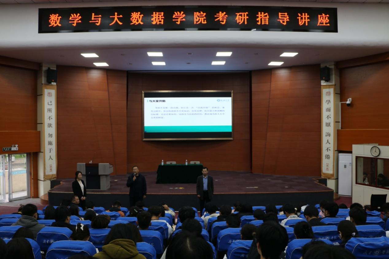 为精准服务学生学业发展需求,有效营造积极向上的优良学风,11月6日下午,数学与大数据学院在理科楼报告厅举办考研指导讲座。活动特邀曲阜师范大学统计与数据科学学院院长赵胜利、聊城大学数学科学学院副院长赵军圣担任主讲。学院党委副书记张长茂、副院长马小翠,以及 2027 届全体学生、2025 级新生共同参加。活动由马小翠主持。
