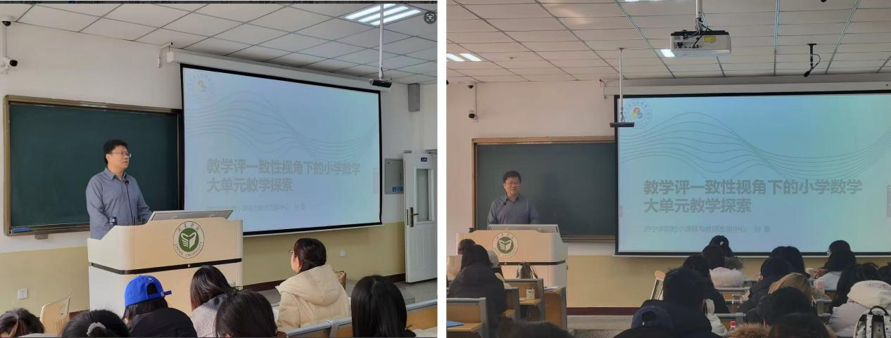 活动伊始,孙鲁以《教学评一致性视角下的小学数学大单元教学探索》为题展开专题报告。他围绕大单元教学的核心内涵与构建框架、实践设计与操作方法、实用工具与实施策略三个维度,结合丰富的教学案例进行了系统阐释,既厘清了前沿教学理念的核心逻辑,又提供了可落地的实践路径,为在场学生送上了一份高质量的小学数学教学理论盛宴。