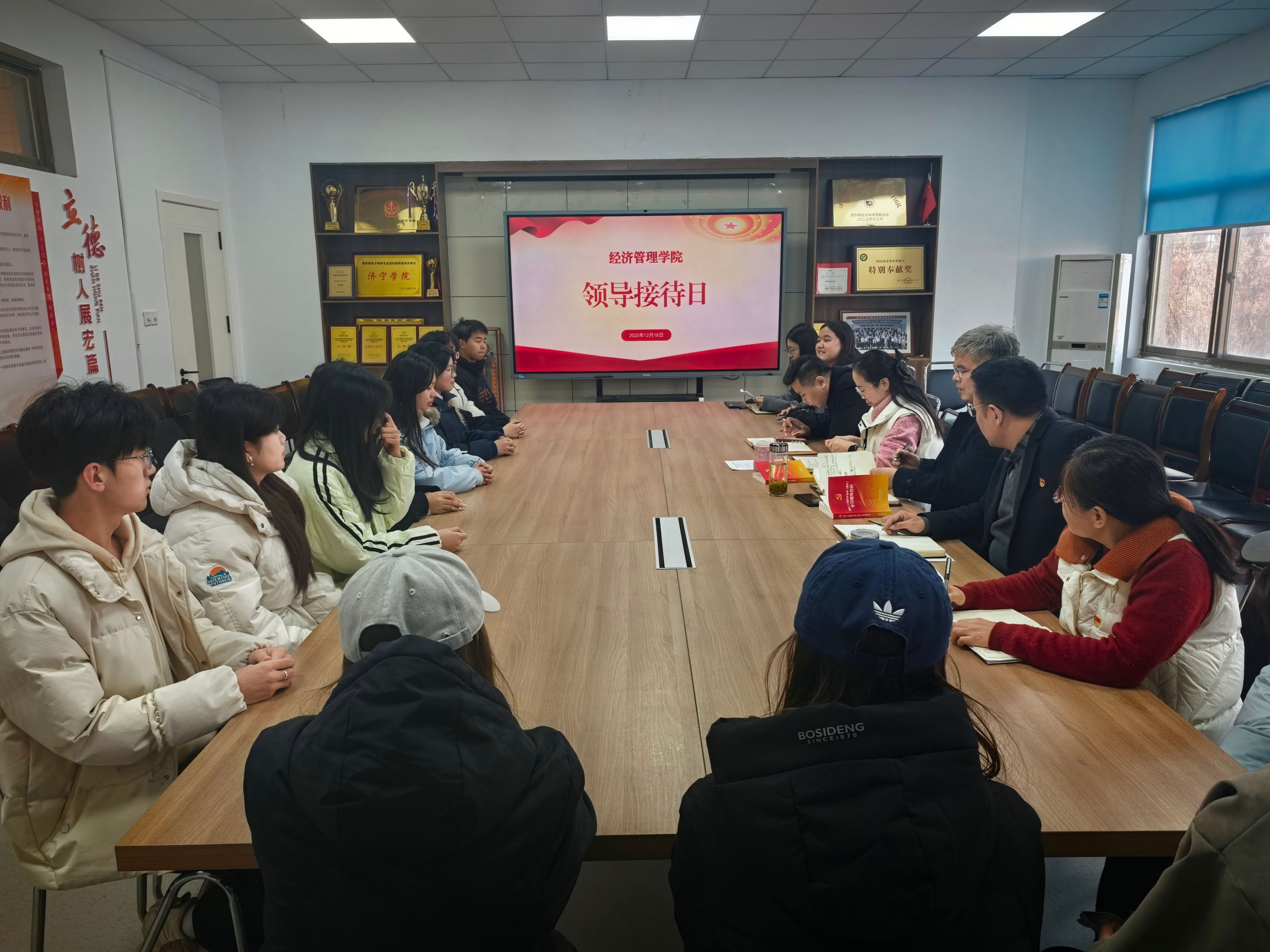 为深入推进民主管理,倾听学生心声,切实解决学生在学习与生活中遇到的实际问题,12月18日,经济管理学院在会议室开展领导接待日活动。学院党委书记乔东华、院长霍雨慧、党委副书记岳现超、副院长董腾及辅导员老师出席活动,与学生代表面对面交流。