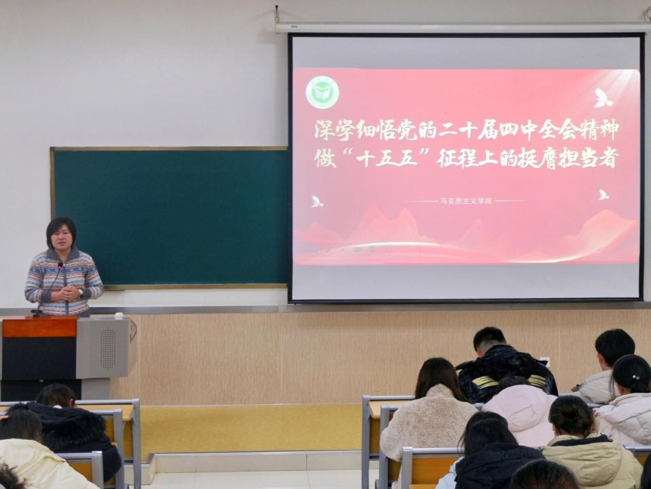 为深入学习贯彻党的二十届四中全会精神,引导师生精准把握“十五五”规划核心要义,12月18日下午,人文与传播学院于2B201教室举办专题宣讲会。本次活动特邀马克思主义学院教师高飞主讲,学院团委书记倪召欣主持,180名学生参与学习。