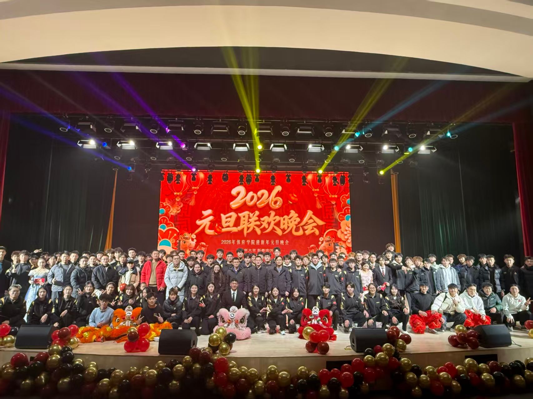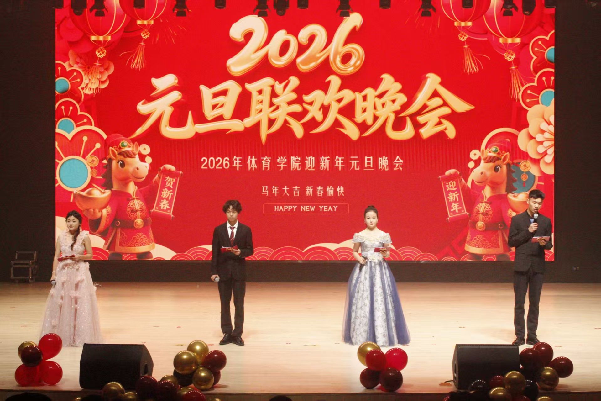 12月22日晚,体育学院“驭马逐光·马上启航”2026年元旦晚会在艺体中心音乐厅举行。学院党委副书记蒿鹏、副院长宋正义,部分教师、各二级学院团委代表与学子欢聚一堂。