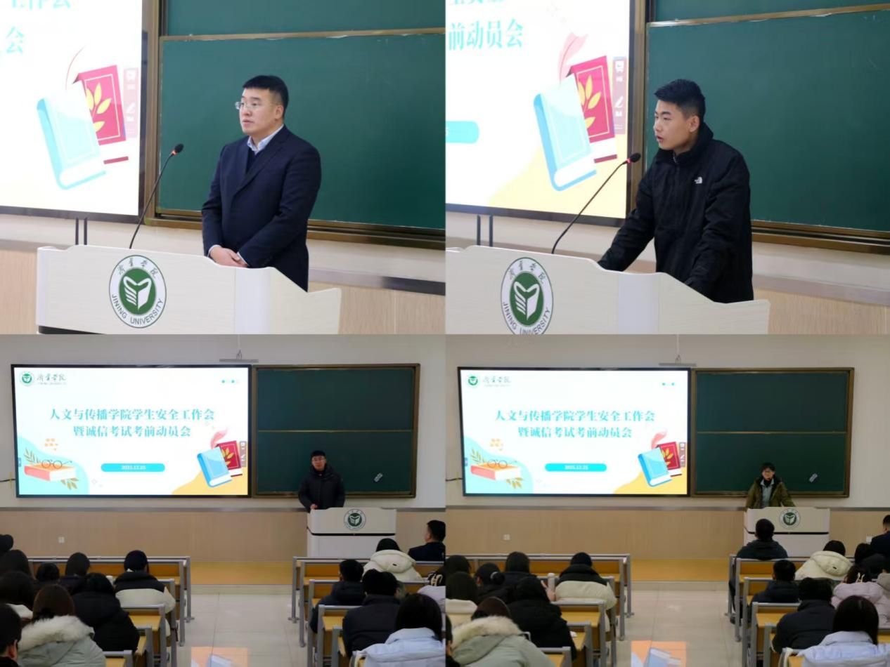 12月25日,人文与传播学院在2B102教室召开学生安全工作会暨诚信考试考前动员会。会议围绕“筑牢安全防线,严守诚信底线”两个主题,全面布置期末阶段各项重点工作,着力保障校园安全稳定与期末考试公平公正。全体辅导员老师,各班班长、团支书、学习委员、纪律委员及宿舍长代表参会,会议由团委书记倪召欣主持。