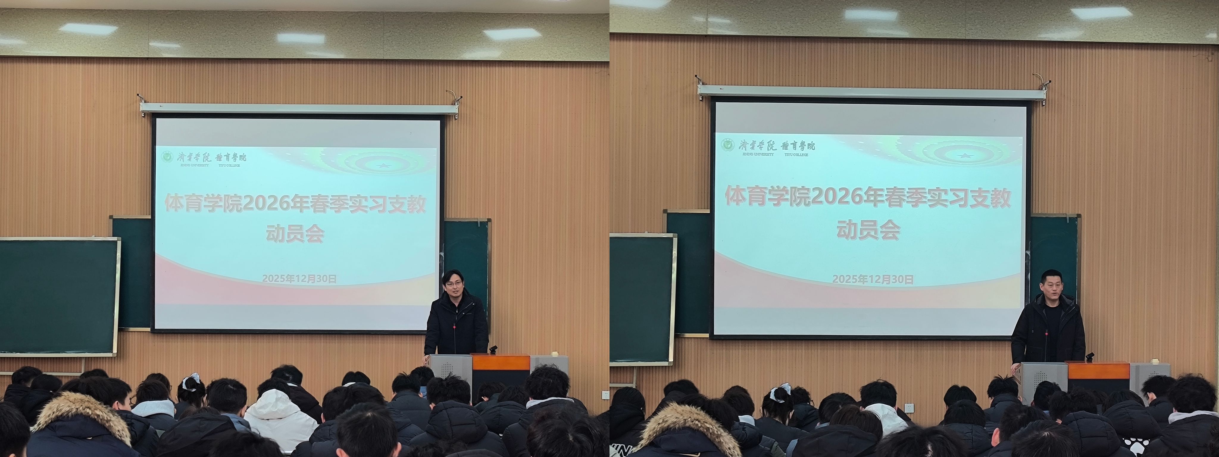 为扎实推进2025年春季学期学生实习支教工作,12月30日,体育学院于4B101教室召开实习动员大会。学院党委副书记蒿鹏、副院长宋正义、实习指导教师代表、全体辅导员、全体班主任及2023级全体学生参加。