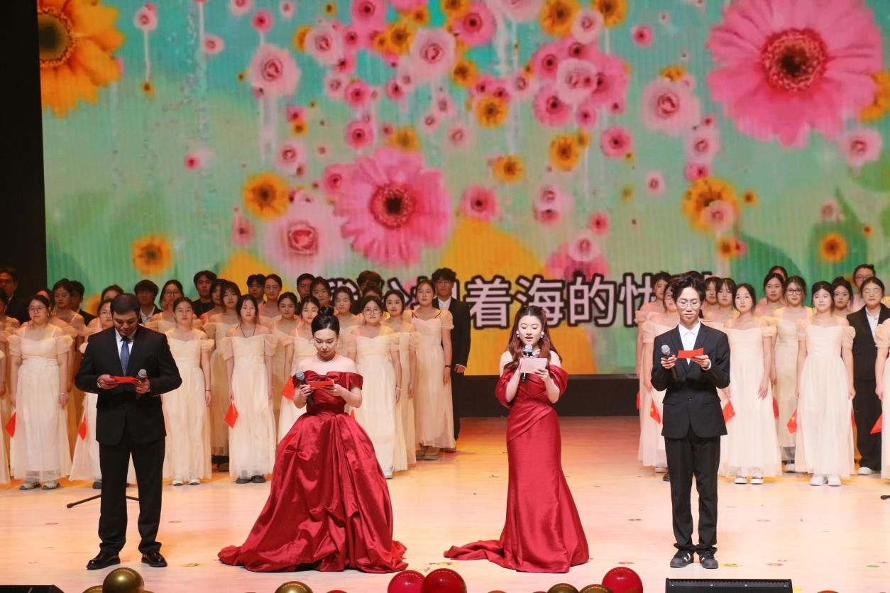 晚会中,为外国语学院2025年度在学科竞赛、文体活动、志愿服务、文明宿舍建设等方面表现突出的先进个人与集体表彰颁奖。榜样的力量与中外联欢的氛围相融,进一步激发了学子们跨文化交流的热情与担当作为的决心。随后,外国语学院辅导员与2026届毕业生代表合唱的《当离别开出花》,道尽师生情谊与青春不舍;音乐学院学子再度登台,以舞蹈《映山红》致敬经典,红色文化的感染力直抵人心。晚会在全体人员齐唱《我和我的祖国》的激昂旋律中推向高潮,真挚的爱国情怀在歌声中升腾,也让中外学子对中国的家国情怀有了更深刻的理解。