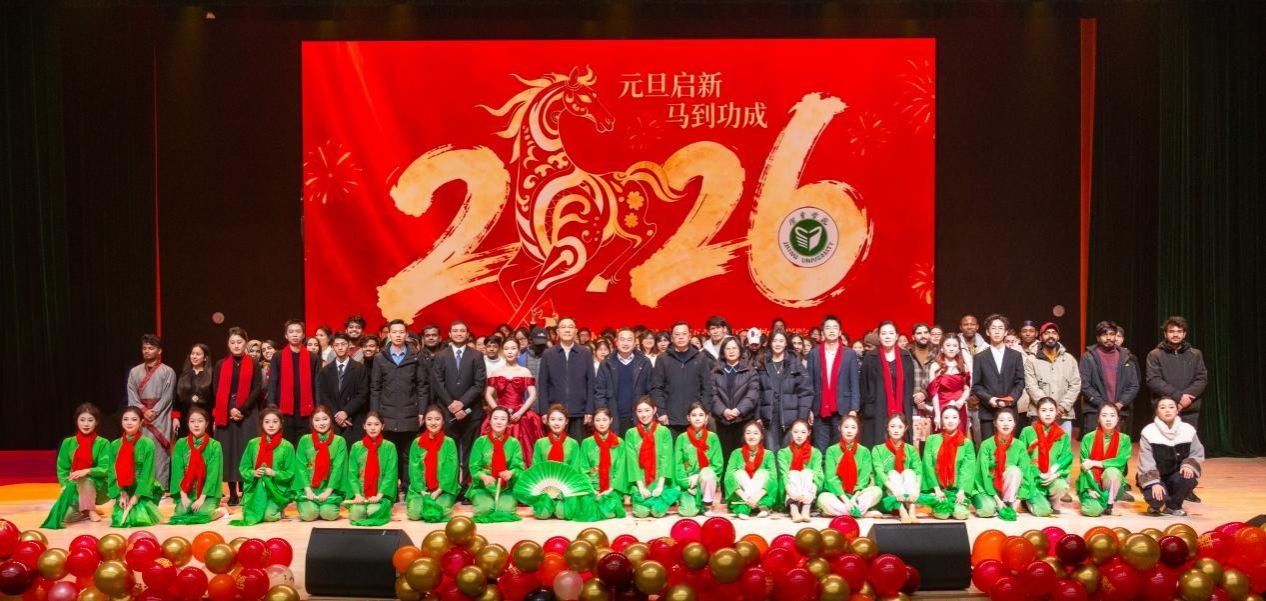 1月6日晚,外国语学院与国际教育学院联合举办的 2026 年新年联欢晚会暨表彰大会顺利举行。两院师生代表与来自蒙古国、非洲、中东等多个国家的留学生齐聚一堂,在中外文化的碰撞与交融中,共贺新年、共话传承。外国语学院和国际教育学院领导班子成员参加活动。