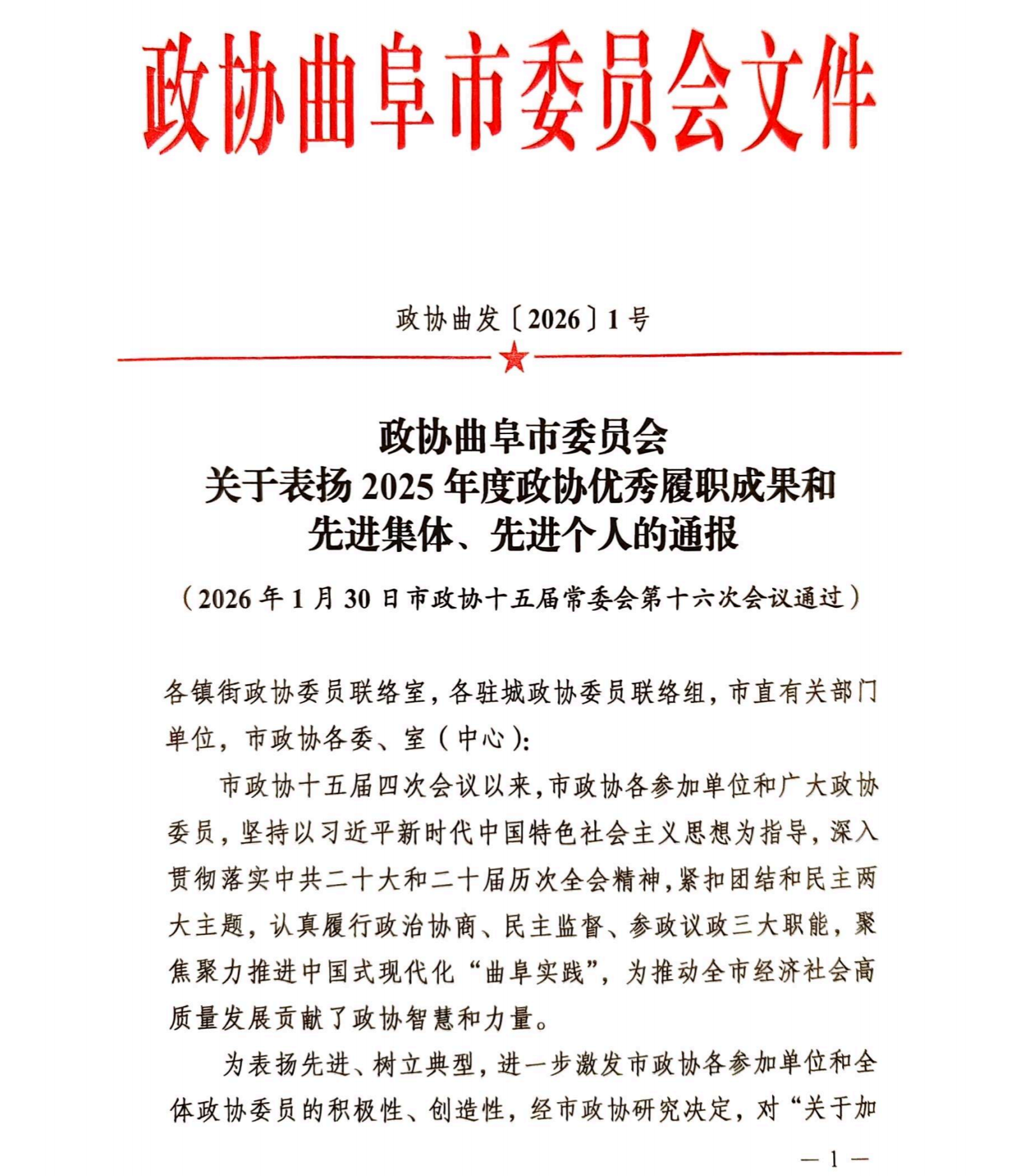近日,政协曲阜市委员会公布2025年度政协优秀履职成果表彰名单,由我校人文与传播学院党委副书记徐俊凯、省人大代表、美术学院教授司继琳、生命科学与工程学院院长赵强、物理与工程学院教授宋军联合撰写的提案《关于打造全国研学旅游示范高地的建议》《关于政校企协同推动曲阜市生物医药与健康产业高质量发展的提案》双双获评“优秀提案”。
