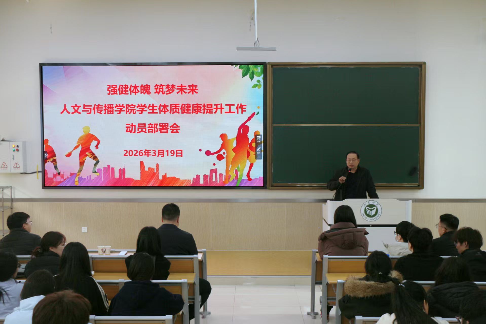 为深入贯彻学校关于学生体质健康工作的部署要求,扎实推进学生身体素质提升工程,3月19日下午,人文与传播学院在2B102教室召开学生体质健康提升工作动员部署会。学院党委副书记徐俊凯、团委书记倪召欣、全体辅导员,以及各班班长、体育委员和学生代表参加会议。会议由学院辅导员何维峰主持。