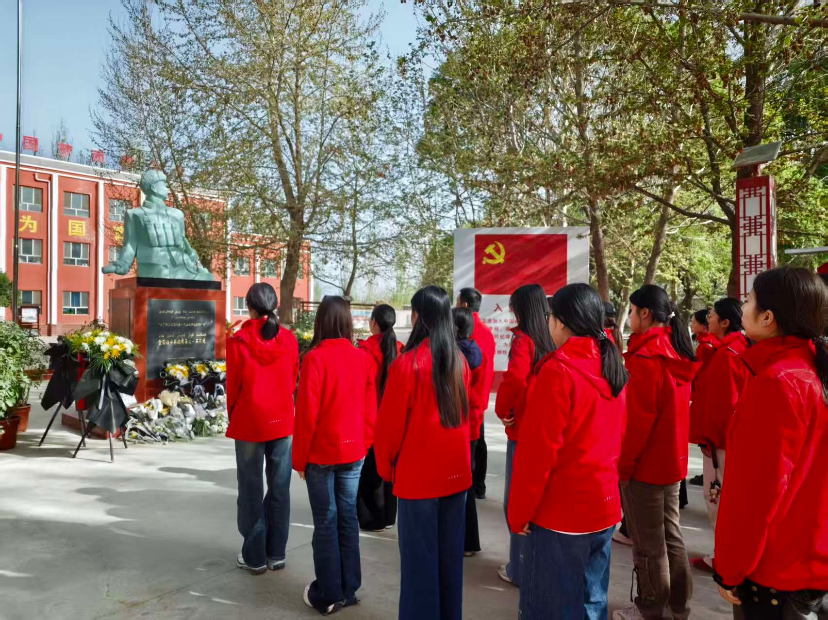 上午,支教团师生抵达乌恰小学爱国主义教育基地,怀着崇敬的心情开始参观学习。师生整齐列队,向战斗英雄司马义・买买提的雕像三鞠躬,表达对革命先烈的深切缅怀与崇高敬意。随后,大家有序走进展厅,聆听讲解员讲述司马义・买买提舍生忘死、保卫边疆的英雄故事,在一张张历史照片、一件件珍贵实物前驻足凝视,深刻感悟革命先烈誓死卫国、不怕牺牲的崇高精神。英雄励初心,誓言践忠诚。最后,全体党员走到党旗前方肃立,面向党旗,高举右拳,庄严宣誓,以重温入党誓词的形式,坚定入党初心,砥砺使命担当。