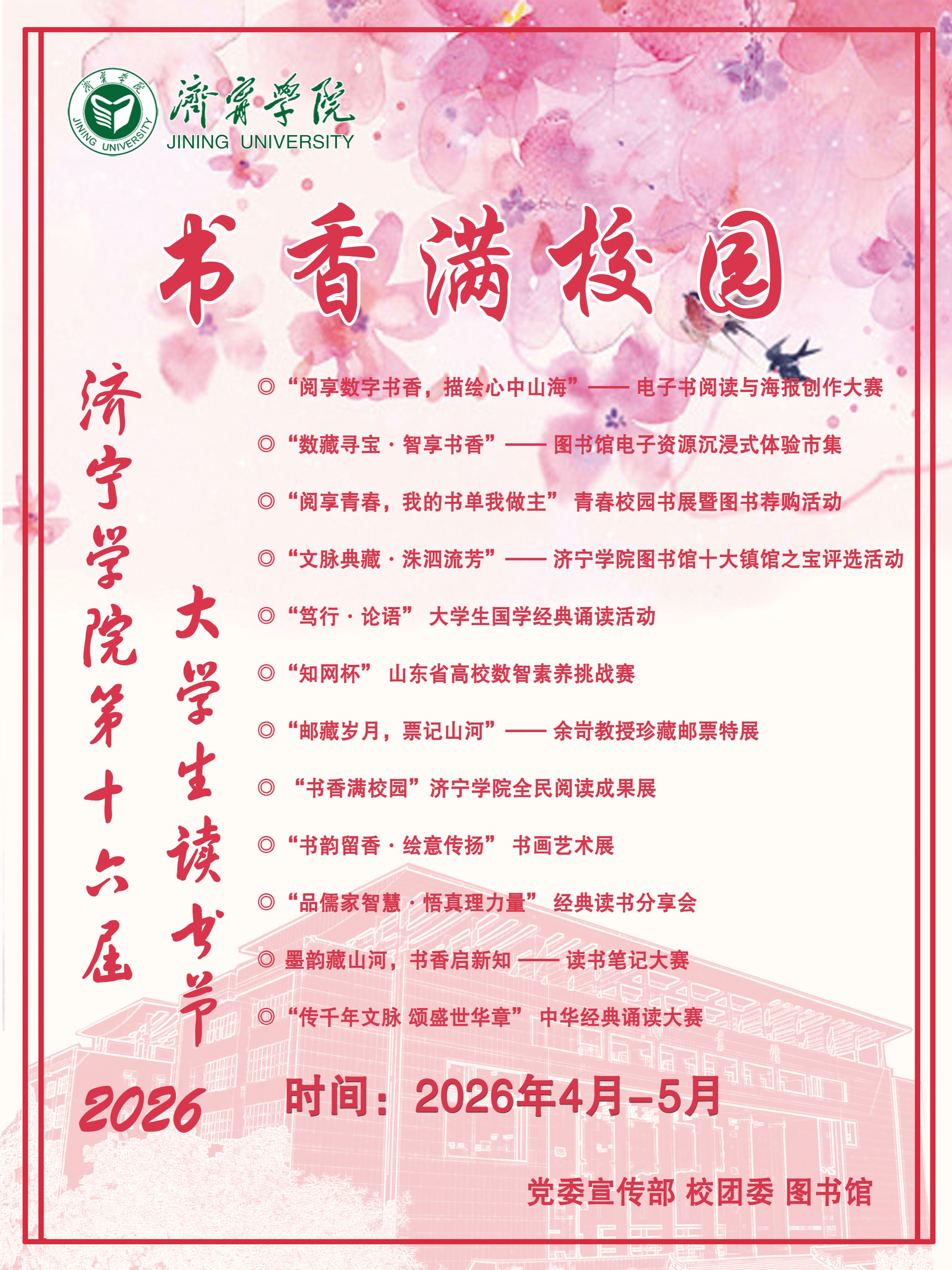 为深入贯彻党的教育方针,落实《全民阅读促进条例》,在第31个“世界读书日”暨首个“全民阅读周”来临之际,亚星在线登录官网正式启动“书香满校园”第十六届大学生读书节。活动为期两个月,面向全体在校师生开展“阅享数字书香,描绘心中山海”电子书阅读与海报创作大赛、“数藏寻宝・智享书香”图书馆电子资源沉浸式体验市集、“阅享青春,我的书单我做主”青春校园书展暨图书荐购、“文脉典藏・洙泗流芳”亚星在线登录官网图书馆十大镇馆之宝评选等12项特色阅读活动,营造浓郁书香校园文化氛围。