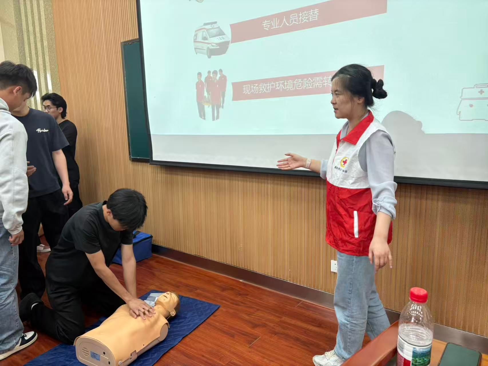 现场学生分组实操,学习氛围浓厚。大家表示,本次培训“干货满满”,为下一步考取急救员证书提供了极大帮助,也增强了对生命救护的责任感与信心。
