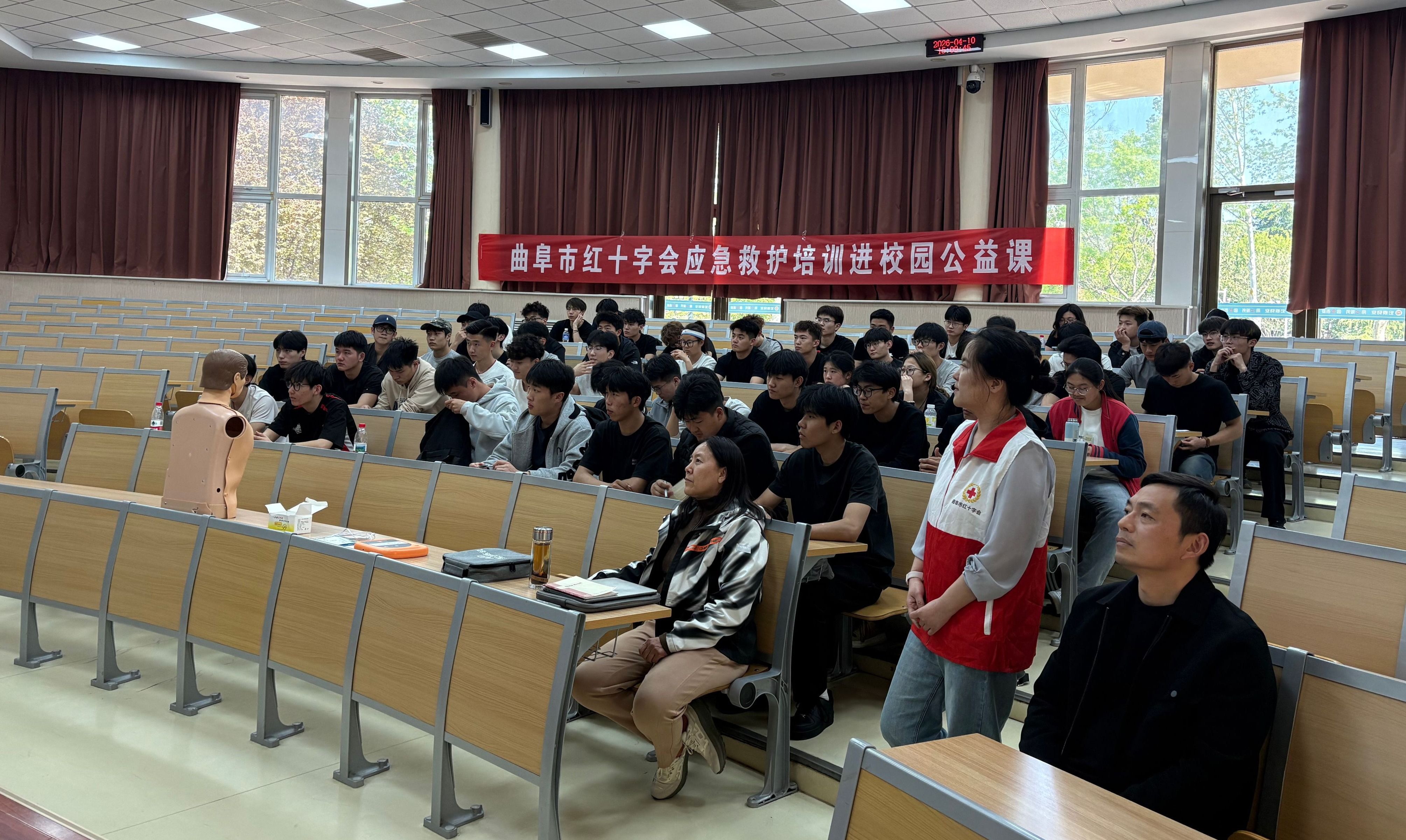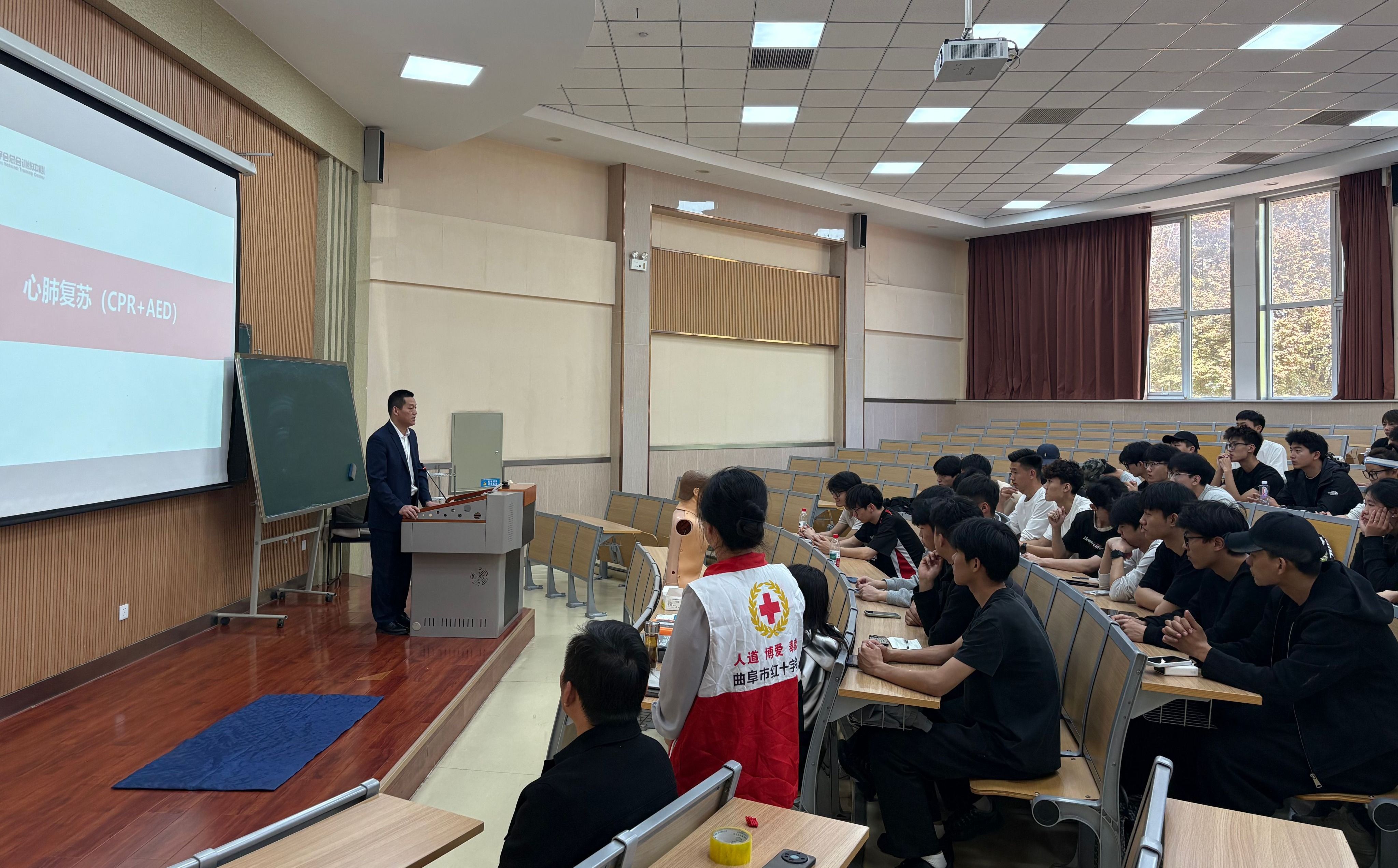 4月10日下午,曲阜市红十字会党组成员、副会长孙玉朋,救护师孙妮来到亚星在线登录官网体育学院,在4B101教室为运动康复专业学生开展应急救护培训公益课。体育学院副院长宋正义、运动康复教研室主任孔伟教授出席活动。
