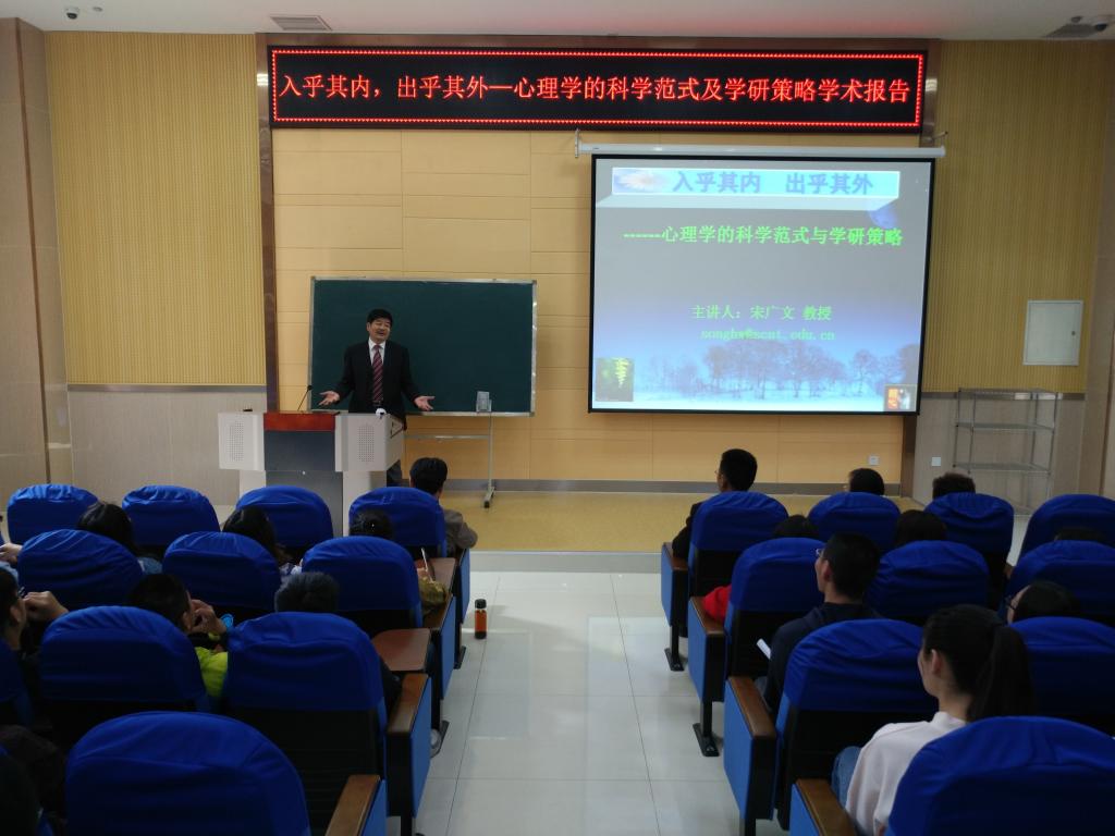 5月9日上午,科研处和教育系邀请华南理工大学心理学系主任宋广文教授来我校作题为《入乎其内,出乎其外——心理学的科学范式及学研策略》的学术报告。报告会由教务处处长李传银主持,教育系主任李群、科研处副处长赵洁以及教育系部分师生170多人参加报告会。