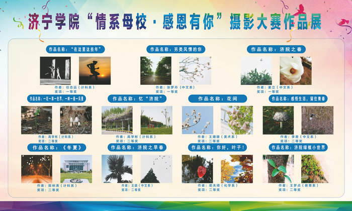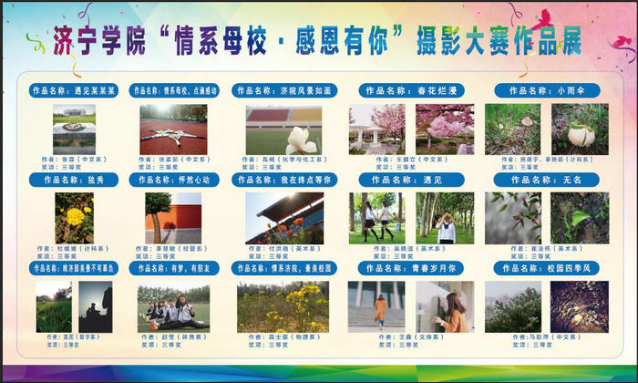 此次大赛历时两个月,共收到作品280余幅,全校各院系150余人参与,最后评出一等奖作品3幅、二等奖作品7幅、三等奖作品15幅,并对获奖作品进行了为期5天的校园展览。这些作品围绕“情系母校•感恩有你”主题,取景于济园的人物、活动、风景等多角度、多方面的彰显了大学校园生活的美好。为进一步给摄影爱好者提供学习交流的平台,大赛组委会在6月8日晚7:00在机电楼B202举行颁奖典礼之际邀请到我校摄影专业人士林长春、王琦、郝焕焕老师分别从摄影要素的不同角度为大家讲解了摄影专业知识,各系 (院)100余名摄影爱好者前来学习。