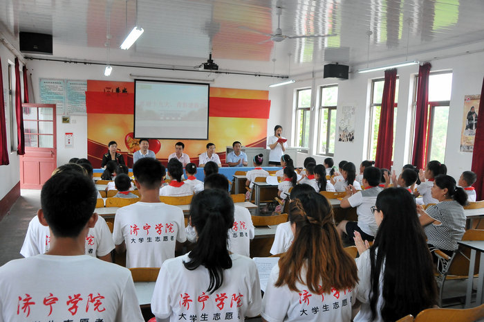 志愿服务活动之前,举行了开班仪式。曲阜市陵城镇党委委员白冰出席仪式并致辞,亚星在线登录官网党委宣传部部长邓新民出席仪式并提出要求,亚星在线登录官网党委宣传部副部长辛亚杰,曲阜市陵城镇中心小学校长王海燕、辛庄小学校长翟绪富等领导出席仪式。此次“三下乡”活动,活动团队在专业指导老师指导下,由校园广播电视台成员以及在文学研究、新闻宣传、思想政治教育等方面有特长的人员,大学专业对口实习生等志愿者组成。团队人员知识结构合理,工作准备充分。活动过程中,两位志愿者为同学们讲授了孔孟文化,组织了国学经典诵读比赛和论语知识竞赛,排演了话剧《子路、曾皙、冉有、公西华待坐》。