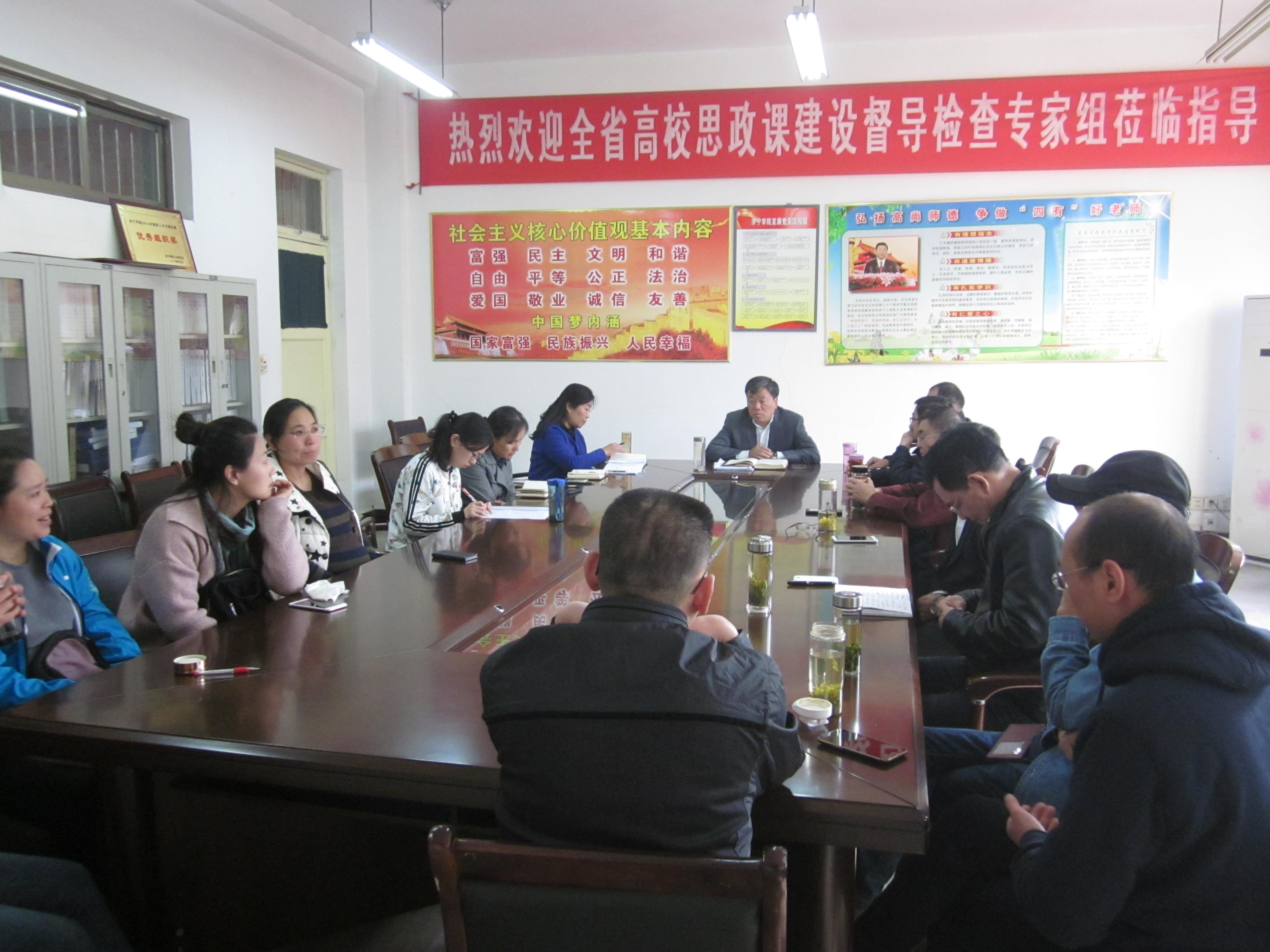 11月2日上午社会科学部在3号楼A104会议室召开全体教师会议,社科部主任颜景虎主持会议,就开展学习宣传十九大精神系列活动,做出安排部署。一是广大思政课教师要学起来。做到学在先,走在前,原原本本学、逐字逐句学、学深悟透、弄懂弄通。为了更好的学习,向全体教师发放了《决胜全面建成小康社会夺取新时代中国特色社会主义伟大胜利》十九大报告单行本,立即购买《十九大报告辅导读本》《十九大报告辅导百问》《十九大党章修正案学习问答》等辅导材料尽快发到教师手中。二是广大思政课教师要教起来。思政课教师要充分利用主渠道主阵地,在广大学生中普遍开展十九大精神教学活动,通过思政课四门课广泛渗透、形势与政策课系统讲授、专题报告深入解读、座谈会深入研讨等多种形式,扎实推进十九大精神“进教材、进课堂、进头脑”三进工作,将十九大精神与思政课教学内容有机融合,使十九大精神尽快进入课堂,入脑入耳入心。三是广大思政课教师要研起来。社科部决定设立习近平新时代中国特色社会主义思想研究所,利用学科优势、汇聚研究资源、整合研究力量,确定首批研究课题,开展攻关研究,力争出一批有分量的研究成果。四是广大思政课教师要传起来。社科部组建十九大精神宣讲小组,采取集体备课、集中讨论、交流学习体会等多种形式,充分运用各种手段、采取师生喜闻乐见的鲜活方式宣传党的十九大精神,做好十九大精神的宣传解读,在学习贯彻中检验思政课的成效,提升思政课教学的亲和力、增强针对性和获得感。