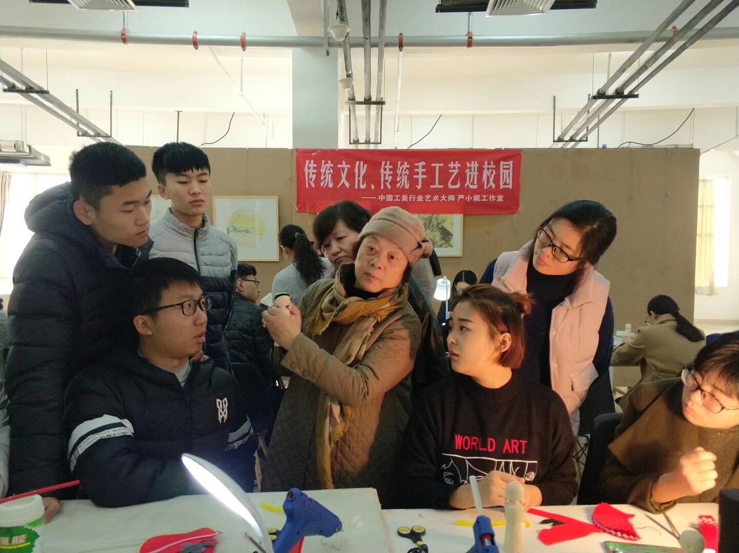 为弘扬民族文化,展现新时代“工匠精神”,美术系特邀请我校特聘教授,贵州省著名工艺美术师、享受省政府专家津贴专家、贵州“木偶娃娃”创始人严晓妮来校为师生授课并指导手工制作。学生表示:严老师的课程也不仅仅是在传授一种技艺,一种艺术形式,更多的是在弘扬一种文化。