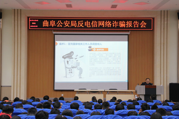 11月24日下午,曲阜市公安局反电信网络诈骗报告会在我校3号楼报告厅举行。曲阜市公安局反电信网络诈骗中心、国保大队、陵城镇派出所,我校学生工作处、安全保卫处、各系辅导员、学生骨干共500余人参加了报告会。