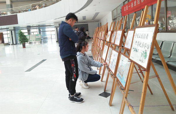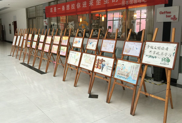 为创设整洁有序的学习环境,图书馆组织策划了“做文明读者,享优美学习环境”手绘漫画作品征集活动。活动以“我眼中的文明与不文明现象”为主题,在大学生读者中征集手绘漫画创意作品,从活动策划、画稿征集、作品筛选到文稿编辑、展览展出,历时2个月,共收到原创漫画作品43幅,经过认真筛选,26幅作品最终脱颖而出,近日在图书馆二楼大厅正式展出。漫画全部出自大学生读者之手,漫画内容都是发生在大家身边的事情。司空见惯的不文明现象,独树一帜的表达方式,令人忍俊不禁的艺术表现手法,使本次漫画展迅速成为同学们关注的热点。大家除了现场看画展,热议漫画中的不文明现象外,还在图书馆微信平台上留言,对不文明现象说不,对文明现象点赞,倡导大家从自身做起、从小事做起,文明礼让,共同建设美好的阅读环境,共同渡过难忘的大学时光。