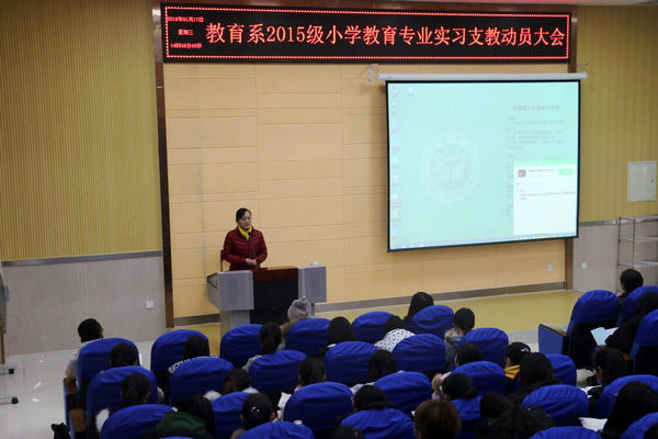 1月17日下午,教育系在文科楼B101教室召开了2018年春季实习支教动员大会。系主任李群、副主任张邦伟、办公室主任孔凡华、辅导员徐艳艳及参加实习支教的2015级小学教育专业的97名同学参加了动员会。动员会由徐艳艳主持。
