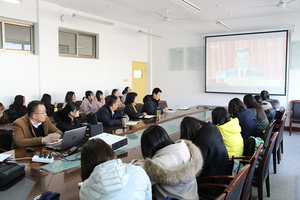 3月5日上午9点,第十三届全国人大一次会议在北京人民大会堂开幕。中文系在会议室组织收听收看十三届全国人大一次会议盛况。中文系党总支委员会成员、师生党员代表和团员青年50余人集体收看学习。
