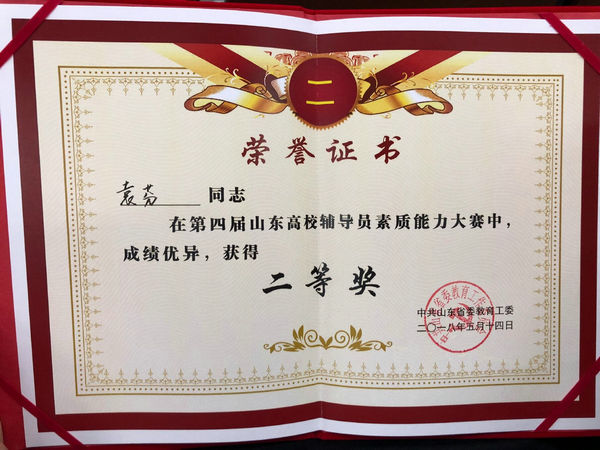 山东省第四届高校辅导员素质能力大赛由山东省委教育工委、教育部高校辅导员培训和研修基地(山东大学)主办,山东高校辅导员工作研究及培训基地(山东建筑大学)承办,山东管理学院协办。省教育厅副厅长、党组成员关延平出席大赛颁奖典礼并讲话。此次比赛共有131名辅导员参加,470余名辅导员代表全程观摩。大赛分为复赛和决赛两部分,包括笔试(基础知识测试和网文写作)、案例分析、谈心谈话、理论宣讲等环节,综合考察参赛辅导员的知识储备、心理素质和职业能力。在三天的激烈角逐中,袁芬表现出色,在决赛中喜获二等奖,实现了我校在此项比赛中的新突破。
