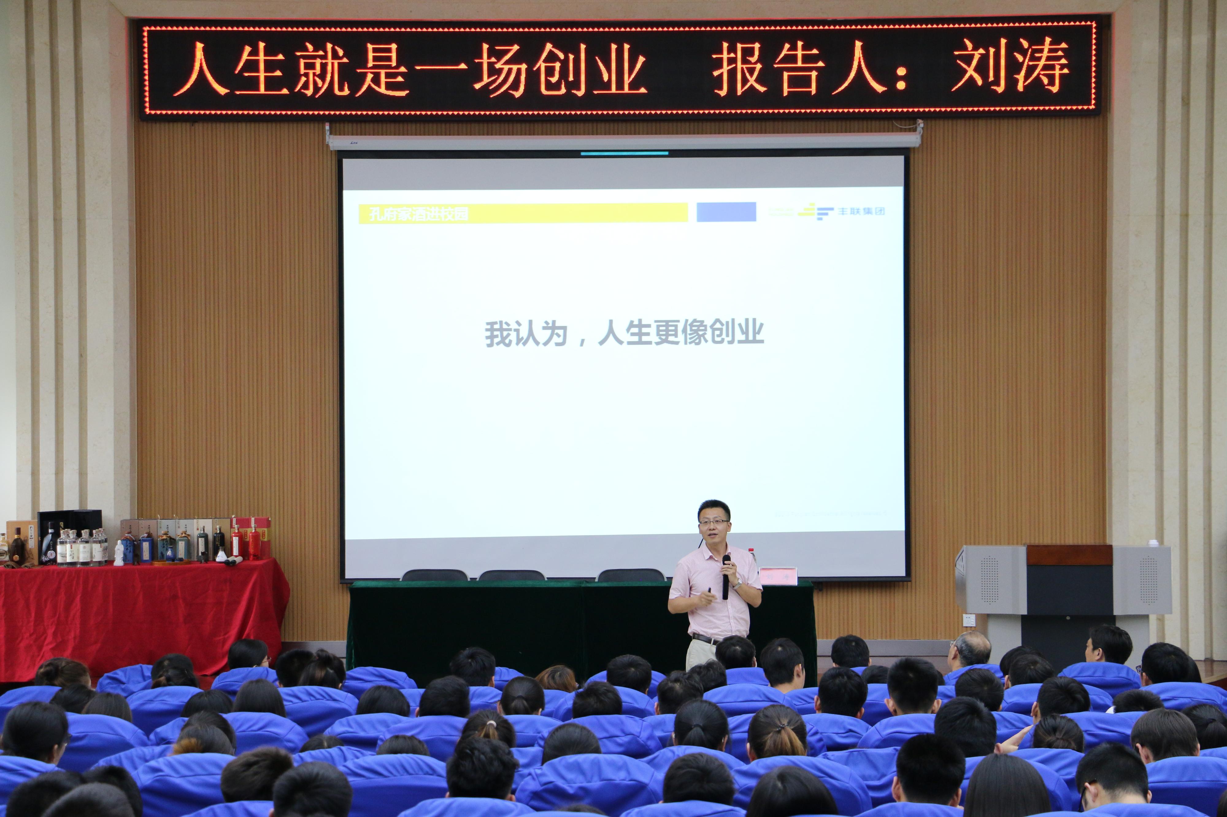5月16日下午,学校在经管楼智慧报告厅举办了优秀企业家进校园系列活动首场报告会。邀请国际知名企业孔府家酒业有限公司总经理刘涛为大学生作了“人生就是一场创业”的精彩报告。孔府家酒业首席品质官、业务发展总监魏金宝,生产部总监马强,人力资源部总监高健,人力资源部经理孔敏,市场部专员徐成文、曹臣、杨鹏飞,学校招生与就业指导处、团委、生命科学与工程系负责同志、毕业班辅导员及500余名学生参加报告会。报告会由招生与就业指导处处长王东艳主持。