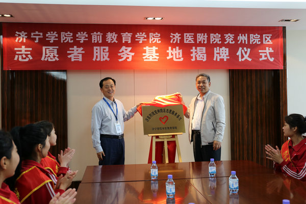 5月21日,学前教育学院大学生志愿者服务基地揭牌仪式在济医附院兖州院区举行。学前教育学院院长孙西安与济医附院兖州院区院长汪新民共同为大学生志愿者服务基地揭牌。