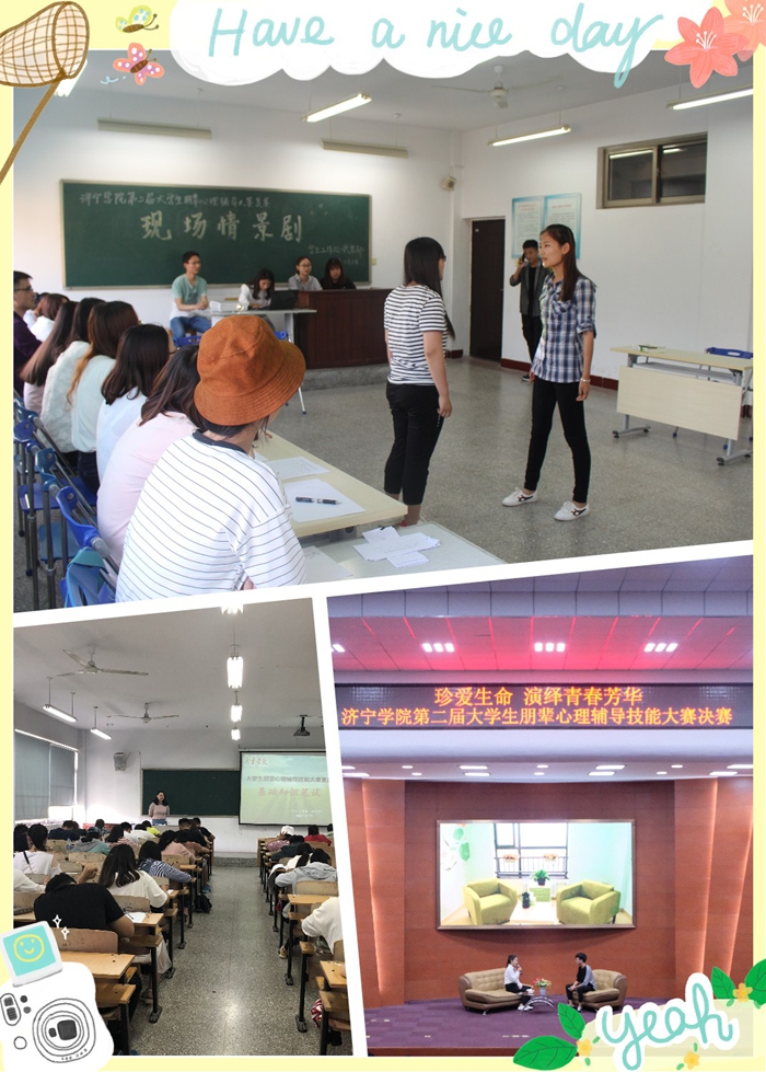 心理健康节从4月9日拉开序幕,先后举办了主题鲜明、特色突出、形式多样的系列活动:第二届大学生朋辈心理辅导技能大赛;第三届心理健康教育主题班会大赛;“理性平和,健康心理”团体沙盘游戏体验;“心灵相约,幸福相伴”校园现场朋辈心理辅导;“沟通你我,激扬青春”人际交往主题心理沙龙;大学生心理情景剧短片DV大赛;山东省高校心理健康优秀论文评选;十佳心理健康教育创新活动评选和明星微平台评选等。