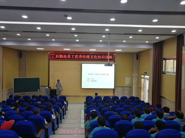 赵雷以“《论语》中的与人相处之道”为题,围绕爱敬不行人伦失序、与人相处—化解我执、《论语》中的交友之道等方面,重点就郑板桥《潍县寄舍弟墨第三书》、孟子“四心”、把他人放心里、把“我”放下、乐道人之善、孟之反不伐等进行了经典讲述。赵雷旁征博引,妙语连珠,诗词古赋、名言警句信手拈来,显示出了为师者深厚的职业素养和人文底蕴,为广大后勤员工献上了一场丰盛的文化盛宴。赵教授的讲座,深入浅出,引人入胜,后勤员工们纷纷表示,能够像大学生们一样聆听大学教授的讲座,万分荣幸,让他们在领略古贤经略魅力的同时,心灵受到了一次优秀传统文化的润泽。