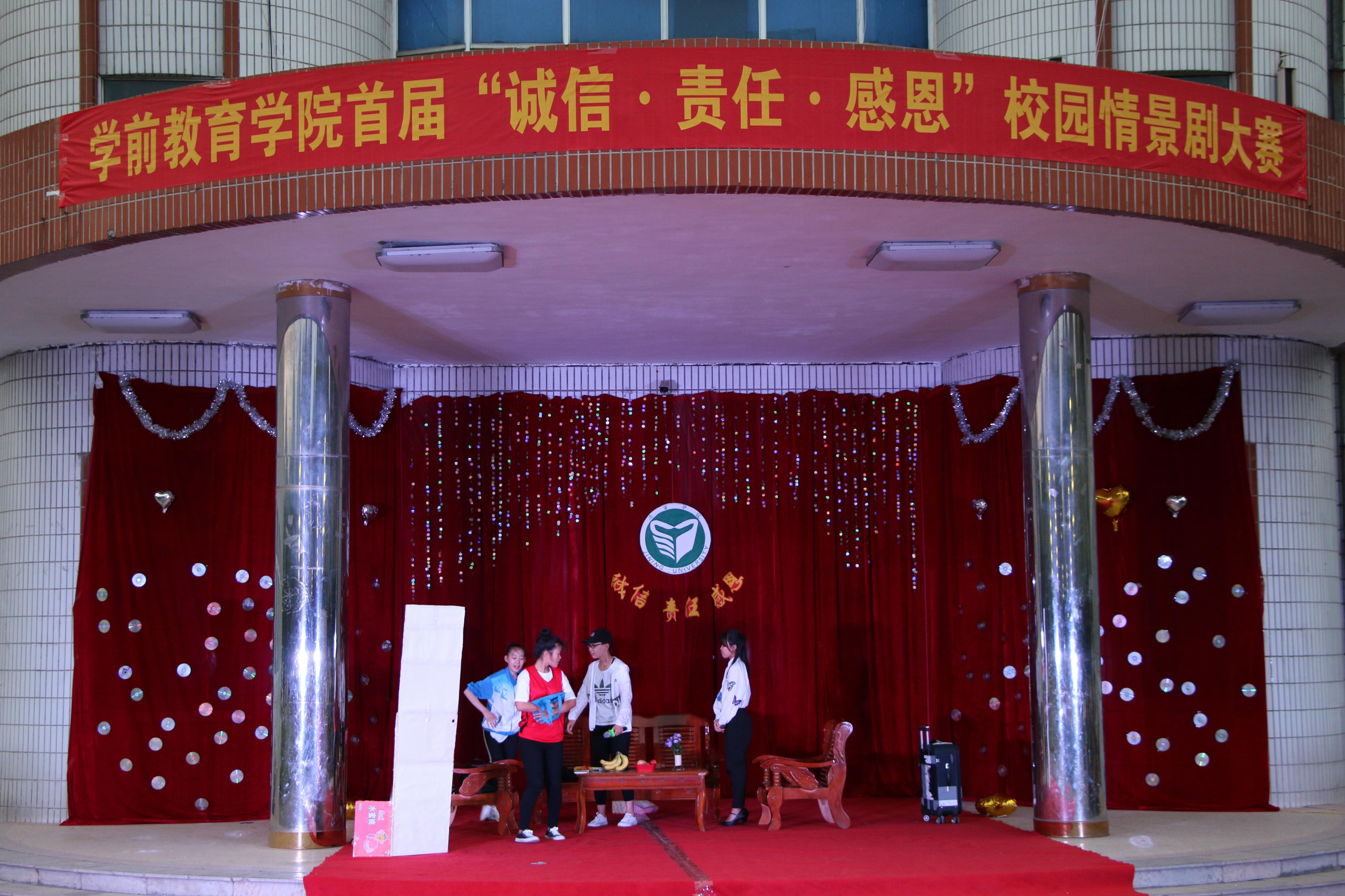 为丰富校园文化,建设和谐校园,2018年6月15日晚,学前教育学院在小广场举行“诚信•责任•感恩”校园情景剧表演比赛。