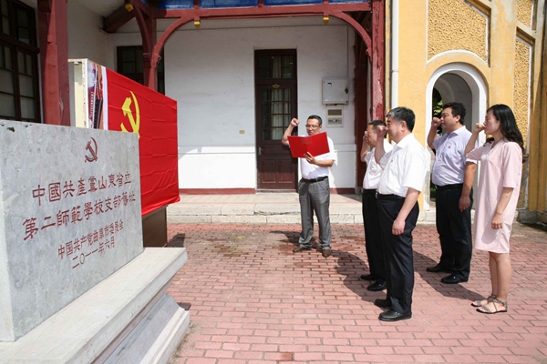 重温入党誓词。在“中国共产党山东省立第二师范学校支部旧址”纪念碑前,全体党员面向党旗举起右拳,以集体宣誓的方式重温了入党誓词,使每名党员都回忆起了申请入党时的思想激情和奋斗追求,回顾了入党宣誓时的庄严承诺和坚定决心,进一步增强了大家的党员意识和党性意识。
