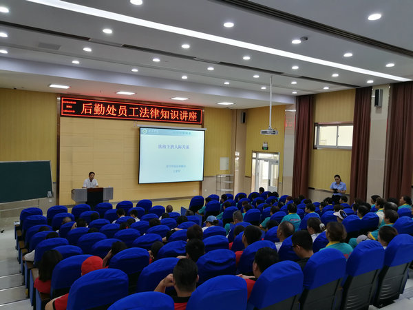 6月29日,后勤处邀请经济管理系副主任、学校法律顾问王爱军副教授,在我校文科楼B101智慧报告厅作了法律知识讲座,明德物业公司、各餐饮公司负责人及一线员工200余人参加,讲座由后勤处副处长刘忠建主持。