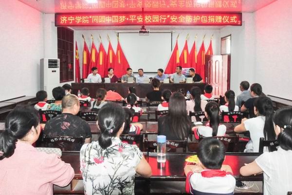 7月19日上午,学校党委组织部部长李刘成,工会主席史仍洲一行赶赴临沂市沂南县铜井镇中心小学举行“同圆中国梦·平安校园行”安全防护包捐赠仪式。铜井镇镇长贺洪雨、副镇长刘爱青、各小学校长、部分教师和学生以及我校选派的四位省派第一书记参加了本次活动。