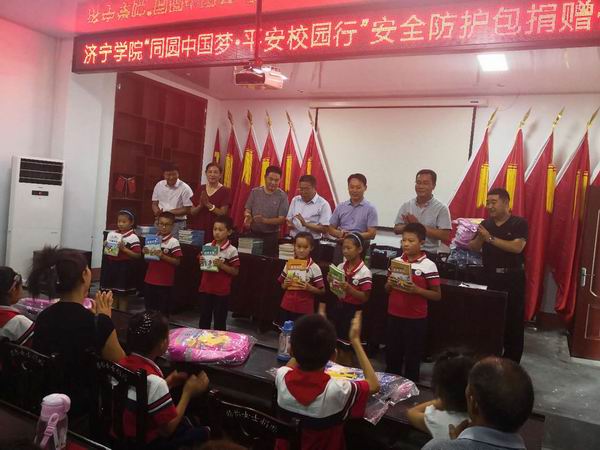 捐赠仪式上,向孩子们发放了安全防护书包和关爱中小学生健康成长丛书,并鼓励孩子们刻苦学习,健康成长,锻炼本领,报效祖国。