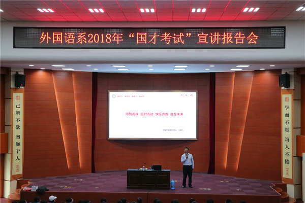 而后讲座重点介绍了中国外语测评中心推出的国际人才英语考试,王教授指出国才考试是在国际交往日益频繁、国际影响不断增强、一带一路大步推进的大背景下推出的英语沟通能力认证考试体系,通过考查学生的国际视野与协商合作能力、跨文化理解与表达能力以及分析问题与解决问题的能力,为用人单位招聘选拔优秀国际化人才提供重要参考和依据。