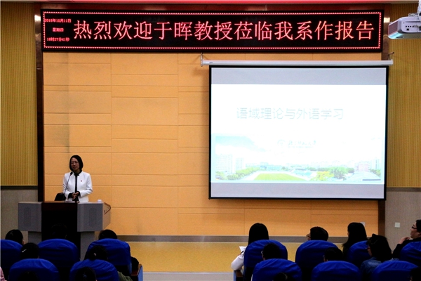 10月11日,北京师范大学于晖教授应邀在2号楼B101智慧教室为我系师生作了题为“语域理论与外语学习”的学术讲座。外国语系师生近二百余人参加了本次讲座。讲座由外国语系副主任张颖主持。