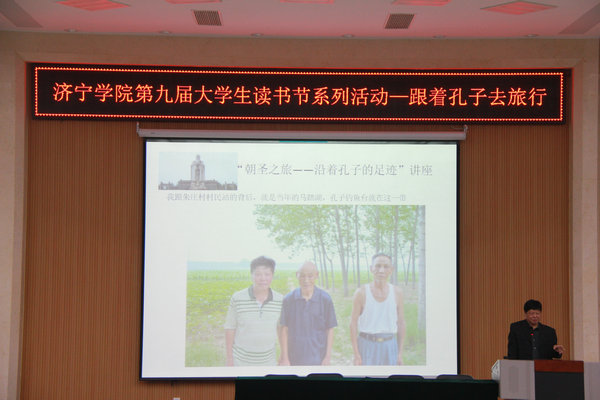11月2日下午,曲阜孔子文化学院教授梅庆吉应校团委、图书馆邀请来我校作了题为《跟着孔子去旅行》的讲座。学校图书馆、团委相关负责人出席本次活动,来自各系学生近五百人共同聆听了讲座。