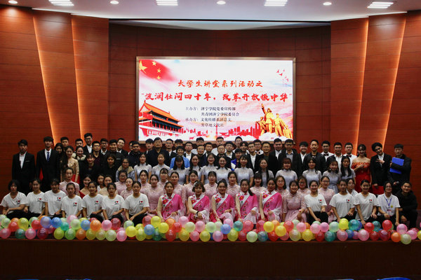 11月20日晚,由校党委宣传部、团委主办,文化传播系团总支和芳草地文化社承办的大学生讲堂系列活动之“波澜壮阔四十年 改革开放振中华”在理科楼报告厅成功举行。党委宣传部部长邓新民、团委书记马新蕾、学生工作处副处长孙婷婷、文化传播系班子成员和300余名师生共同参加了此次活动。